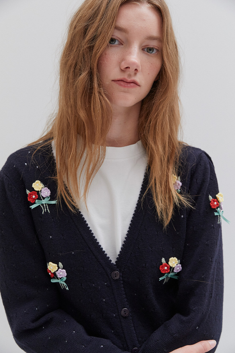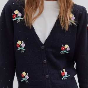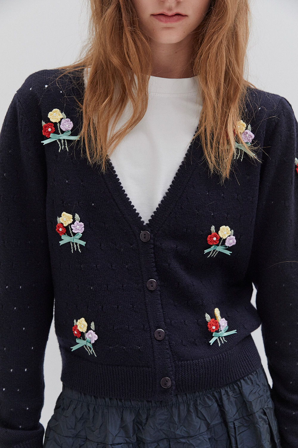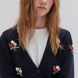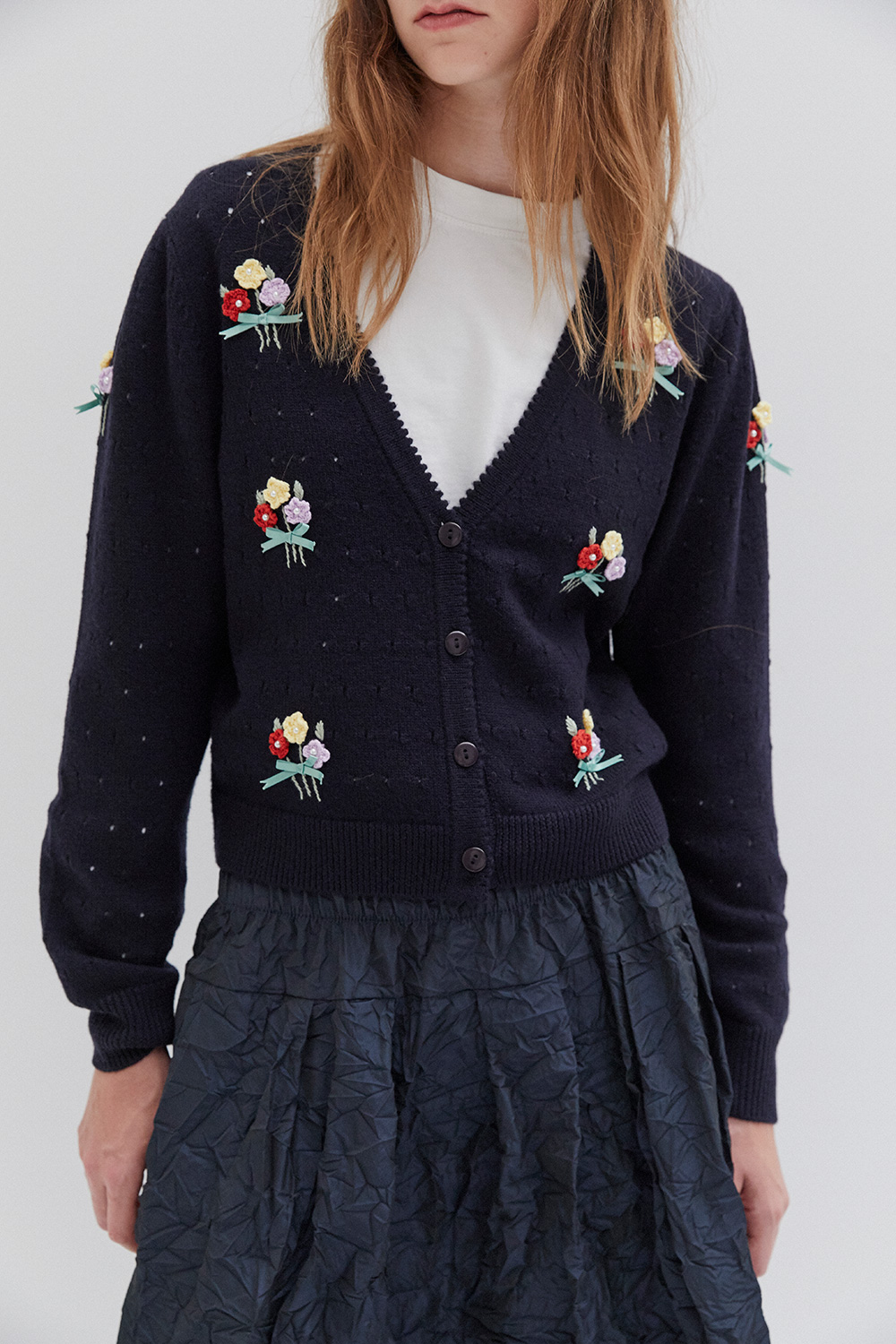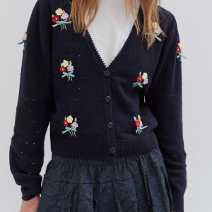 Made from featherlight but cosy merino wool, it’s the perfect layer for transitional dressing. Patterned with a signature RIXO bouquet embroidery and delicate pearl beads it evokes a dreamy nineties nostalgia.