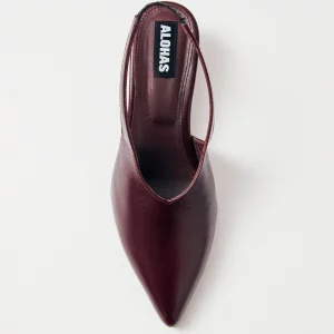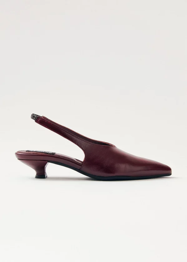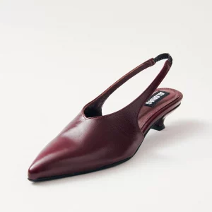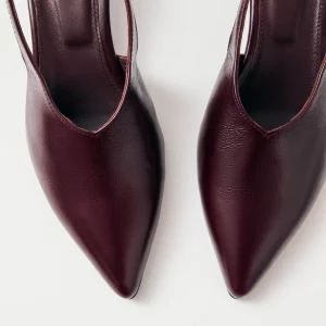 Crafted from burgundy crinkle-effect leather, the Eros pumps rest on a low 4mm heel and feature an elasticated slingback strap, ensuring non-negotiable comfort. The sharply pointed toe and minimalist, long vamp add the touch for an elegant silhouette.