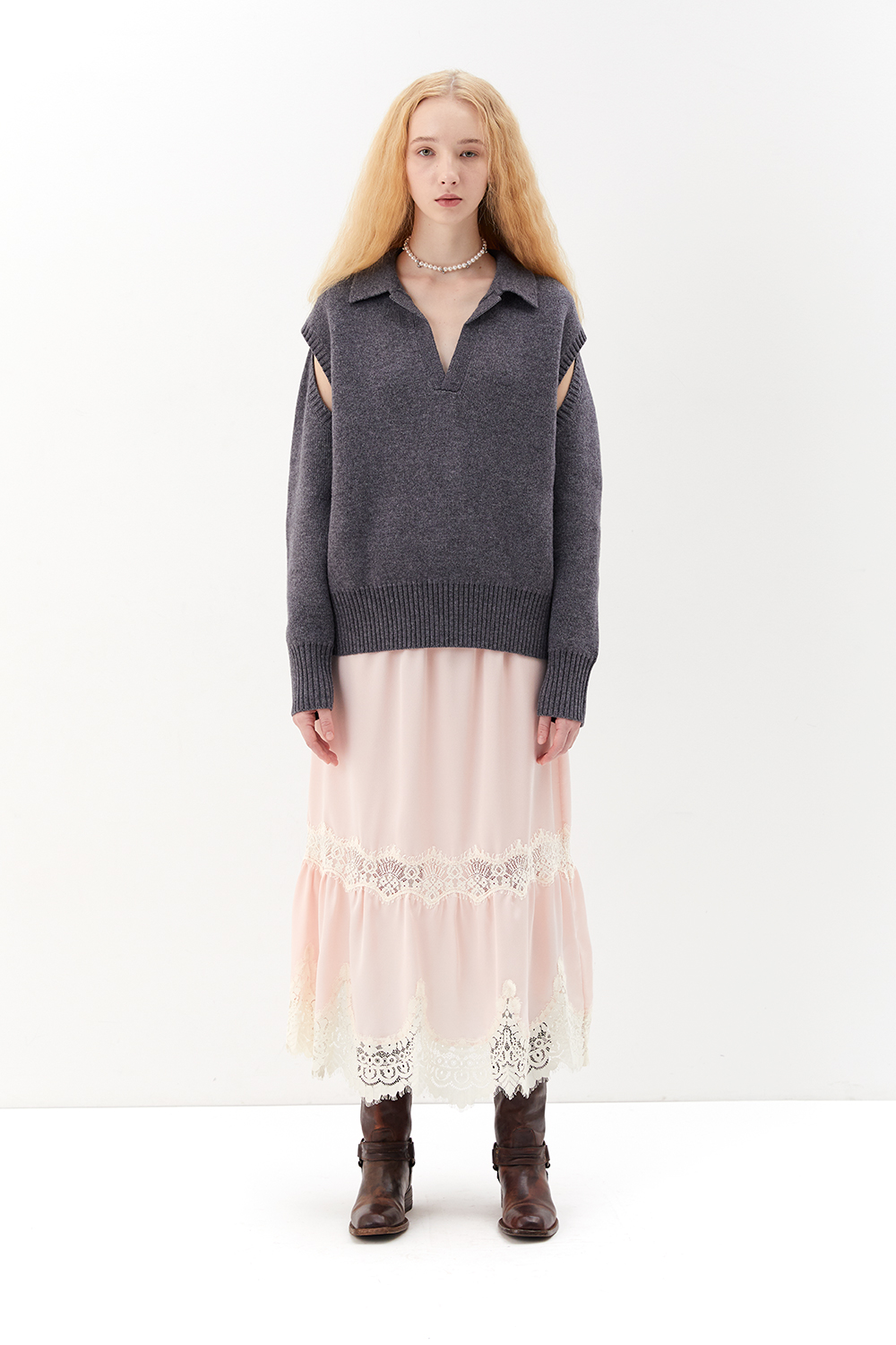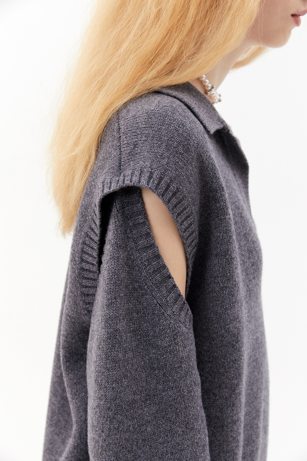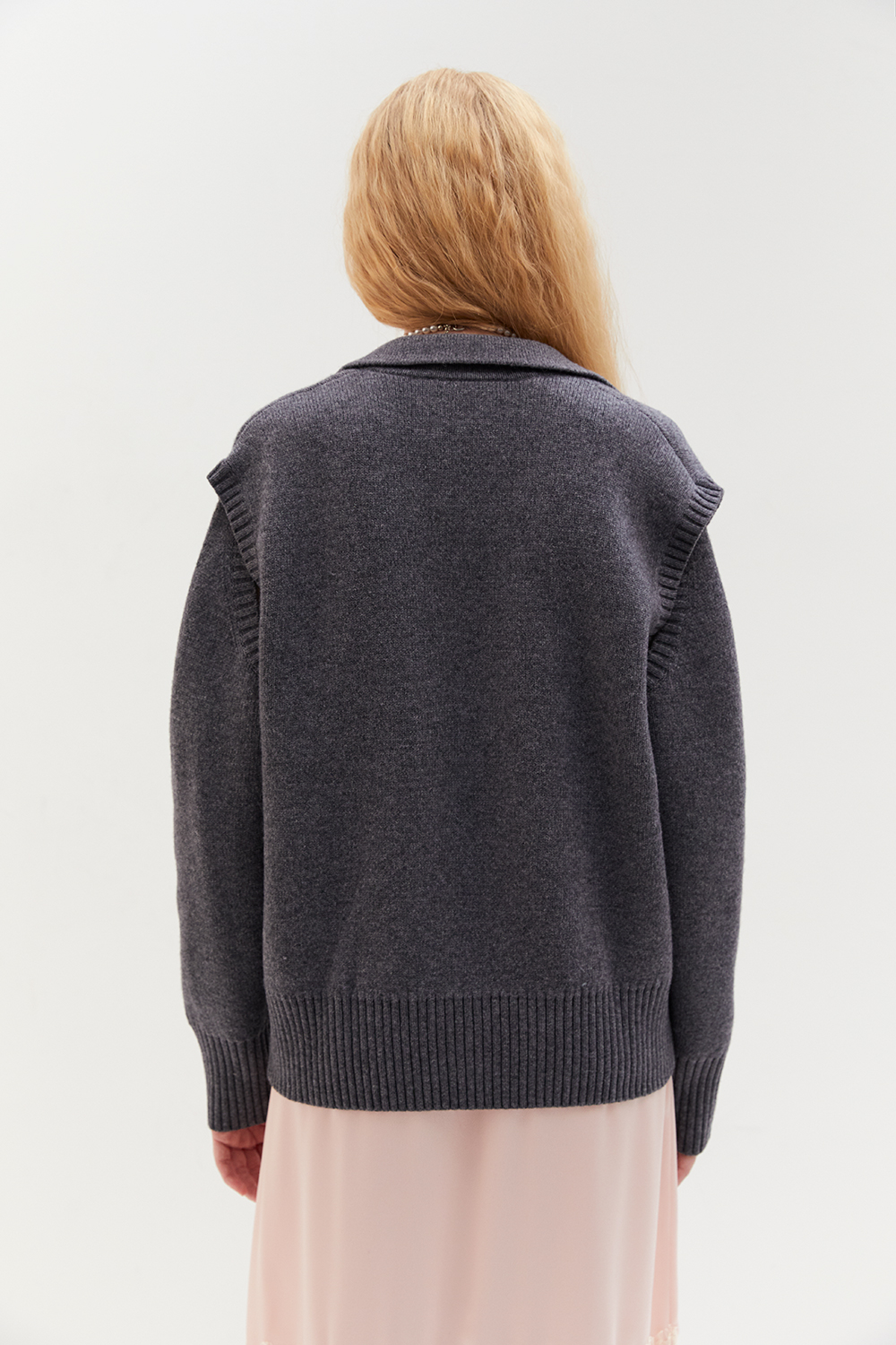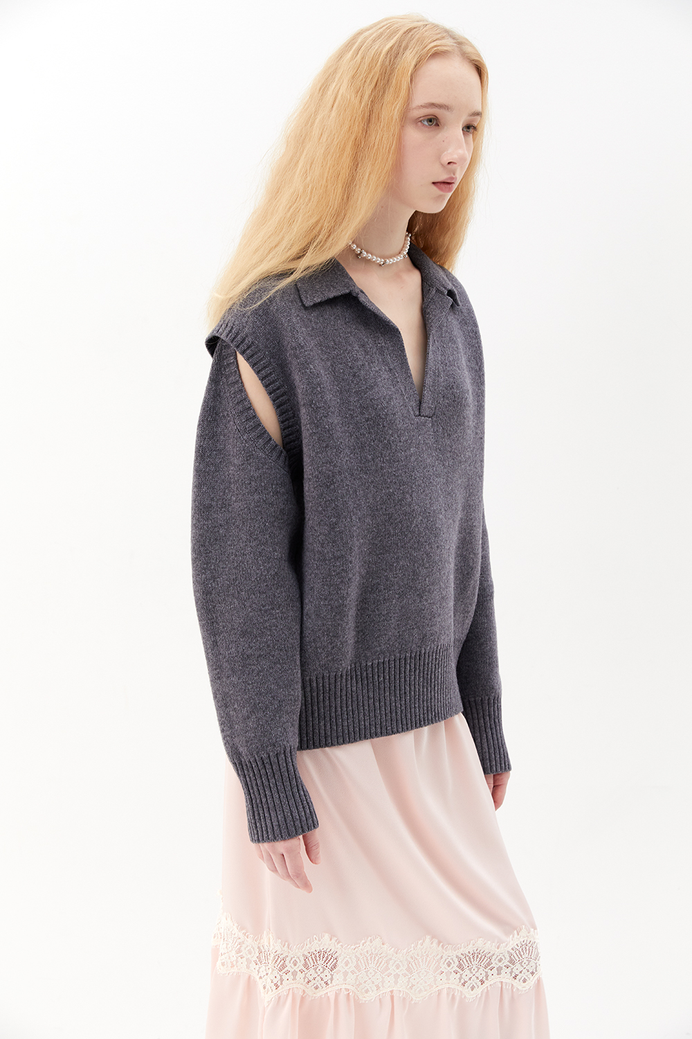 Gray full-needle knitted wool-blend polo sweater with cut-out details.