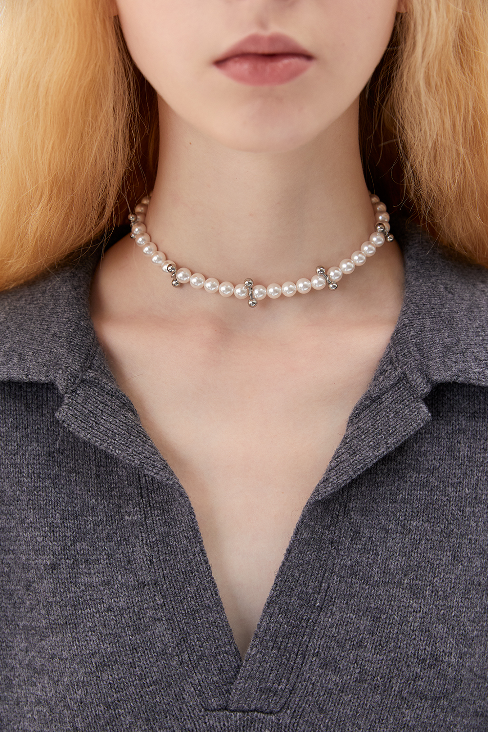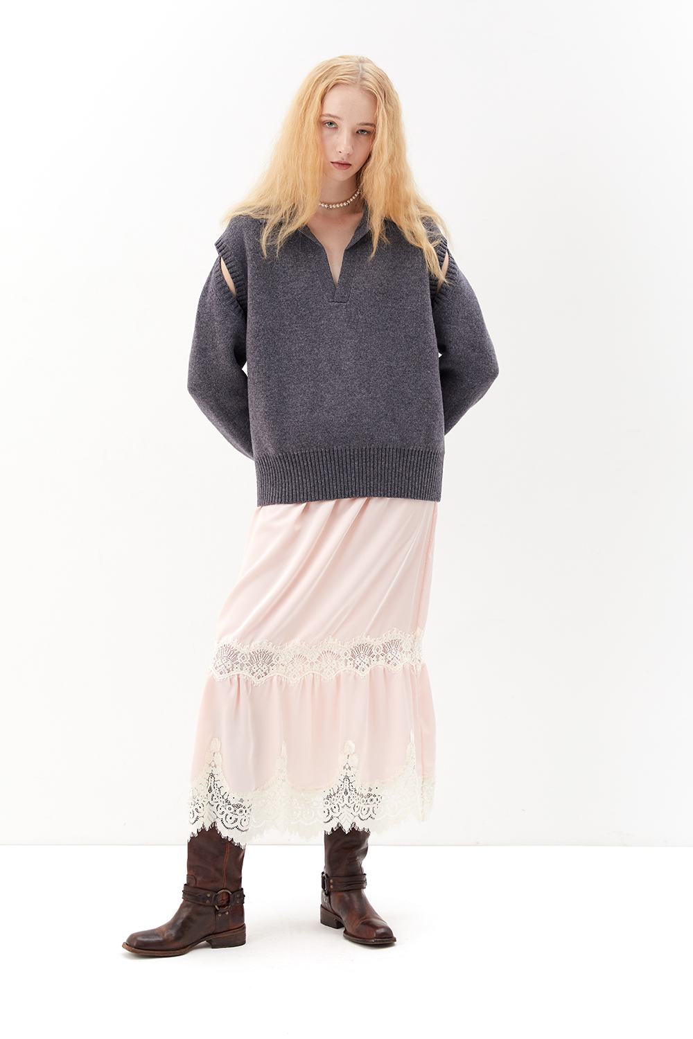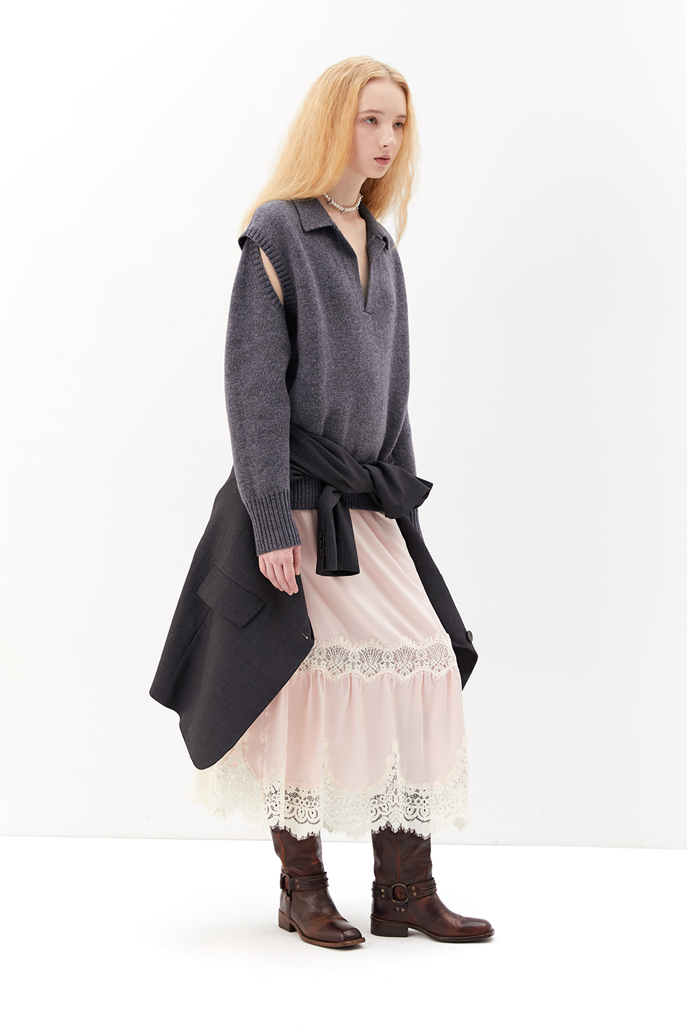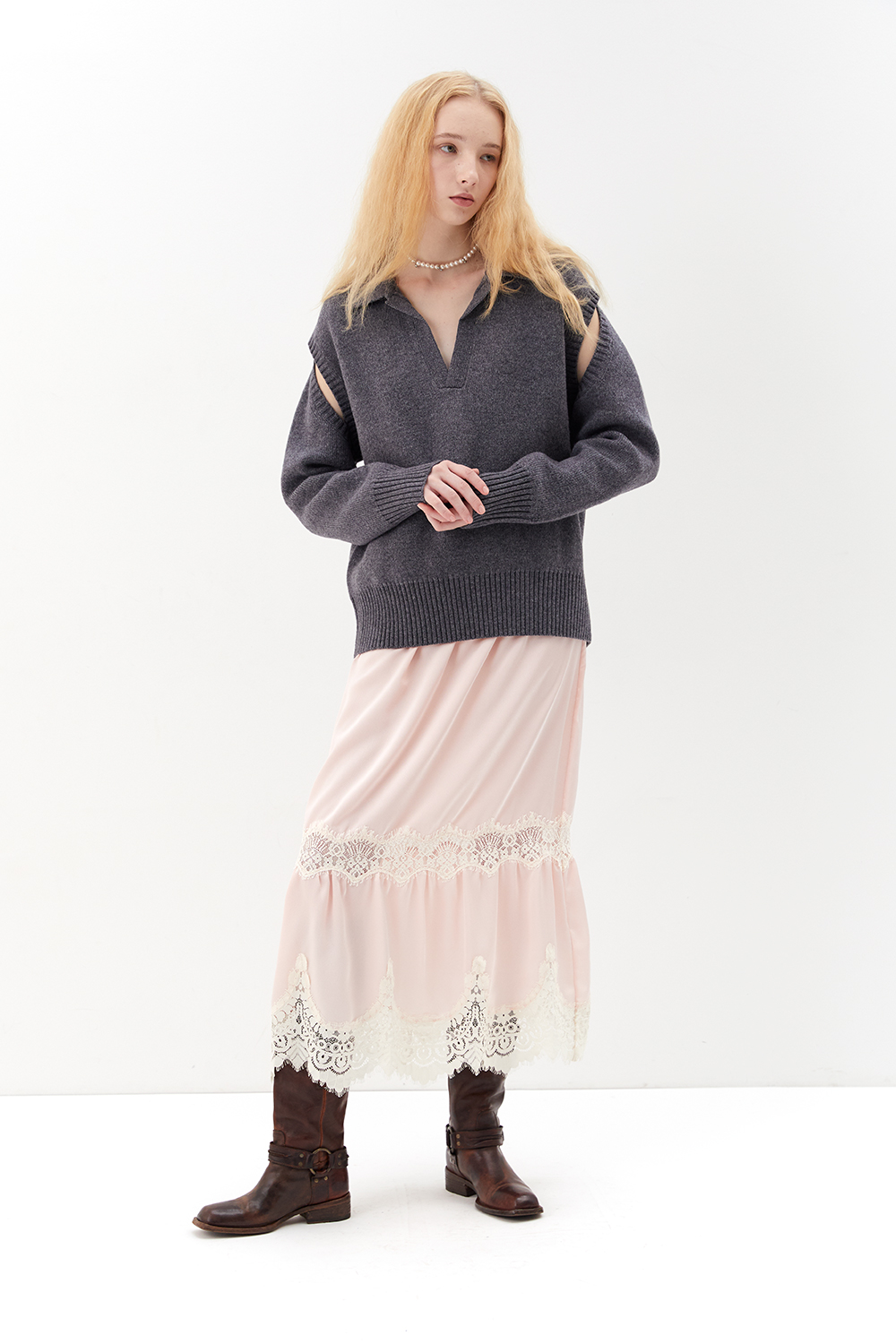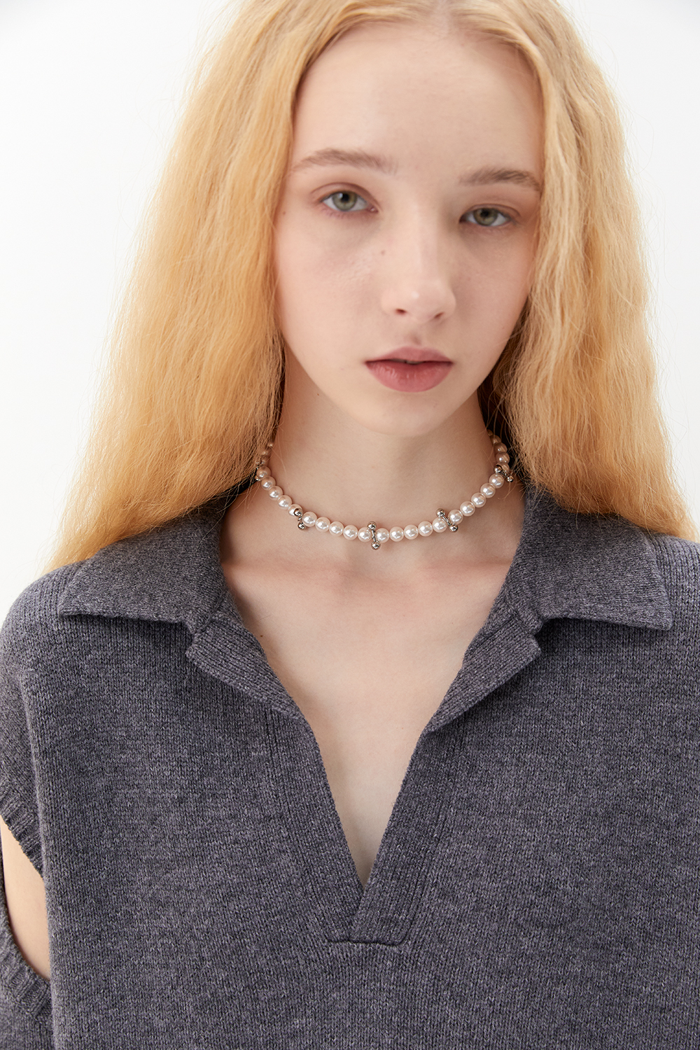 Gray full-needle knitted wool-blend polo sweater with cut-out details.