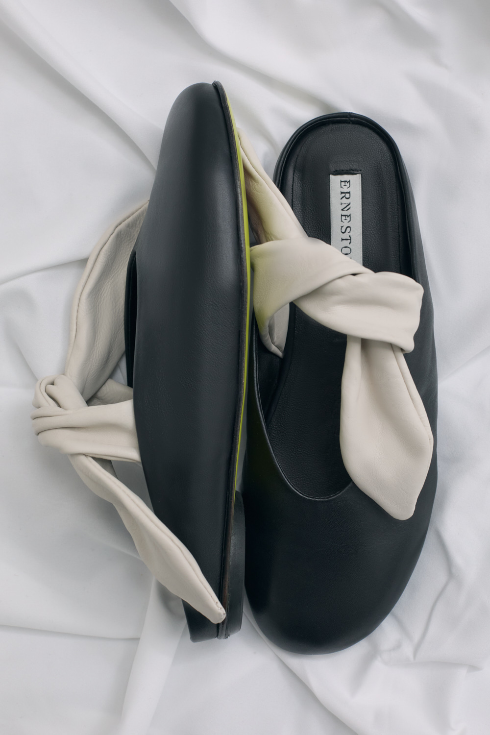 Ernesto Dolani black soft leather mule with milk leather bow detail .