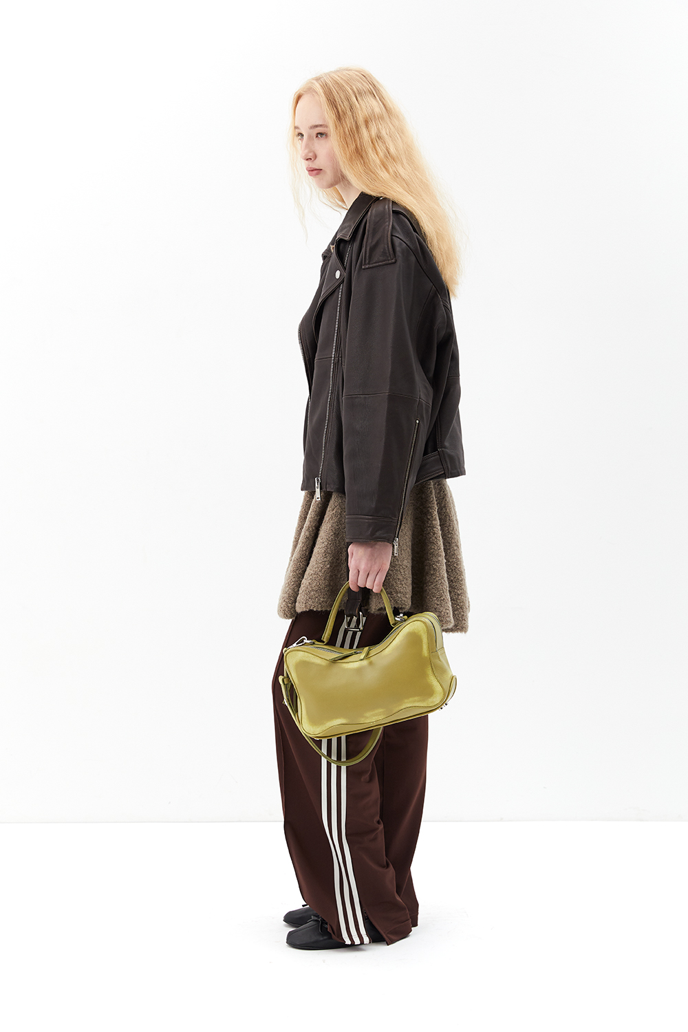 Biker jacket in genuine leather with asymmetric zip closure and wide collar.