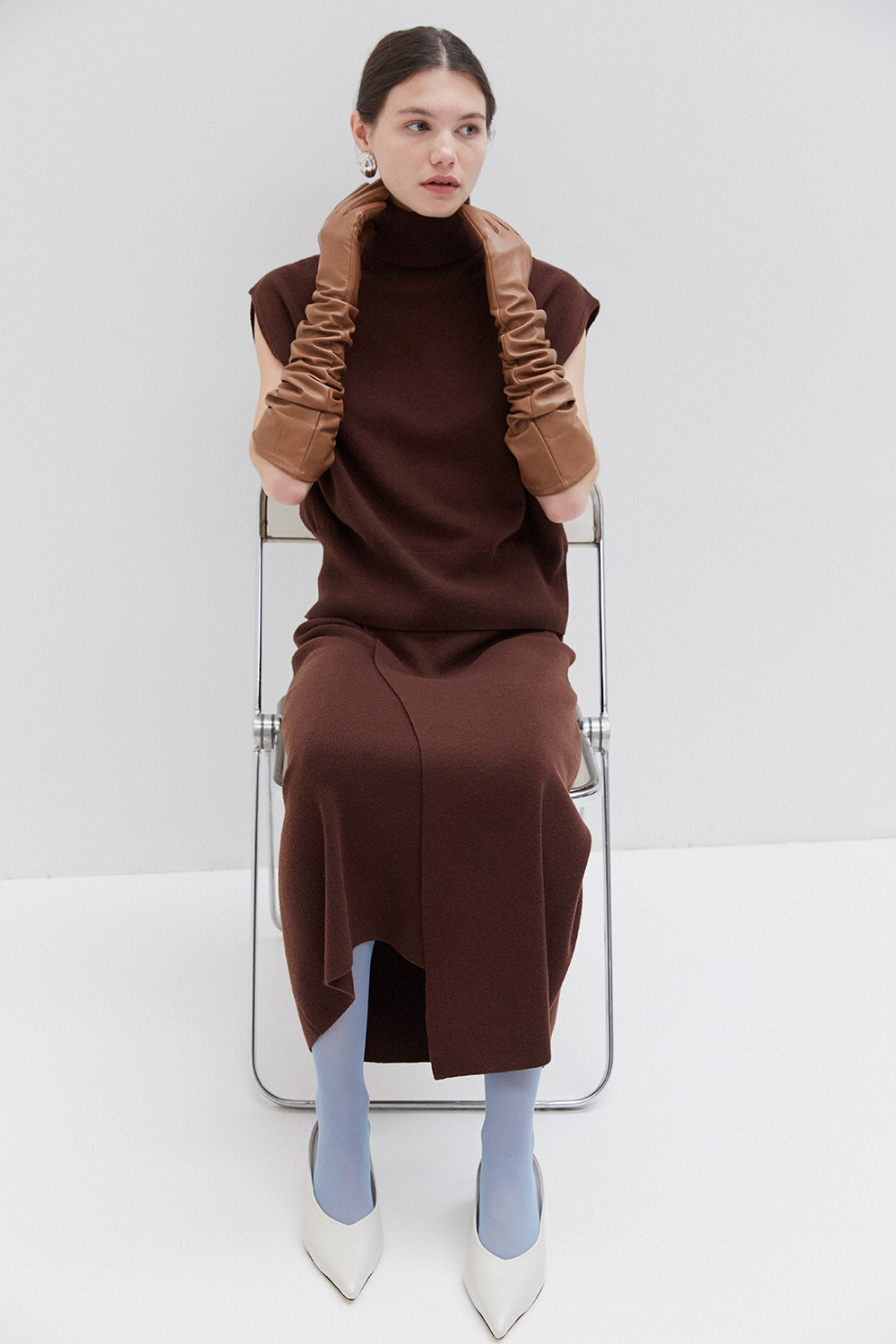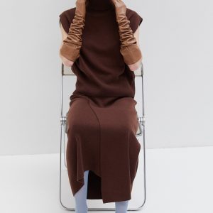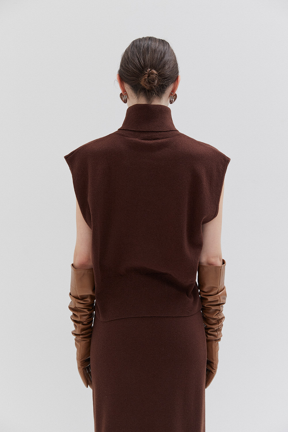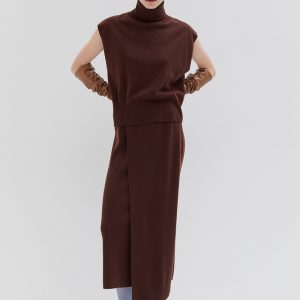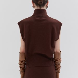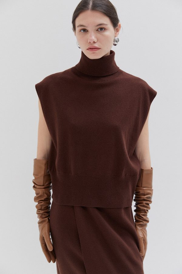 Knitted sleeveless turtleneck vest offering a comfortable relaxed fit. Features a high neckline and a straight-cut silhouette, versatile for layering or standalone wear in any season.