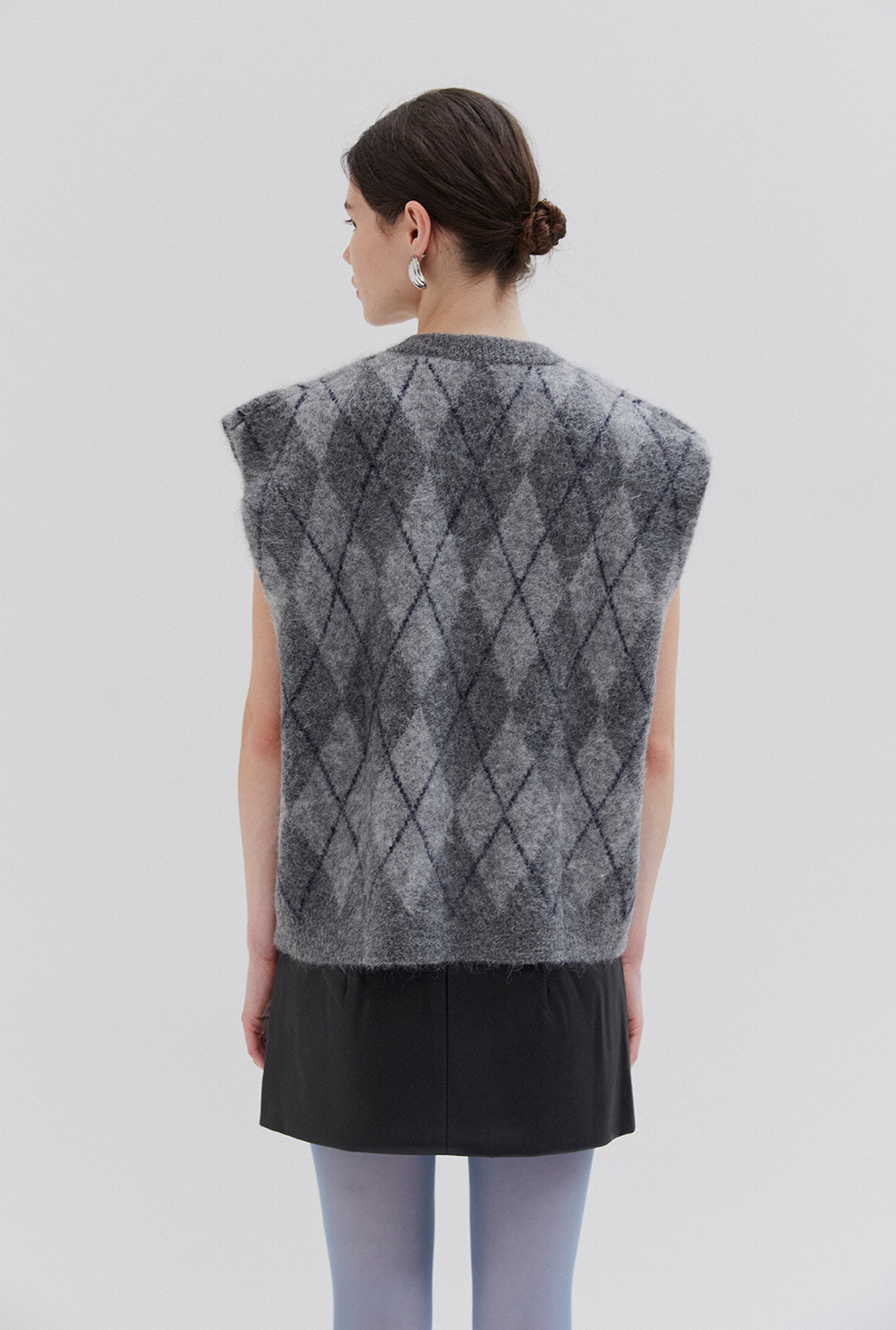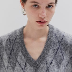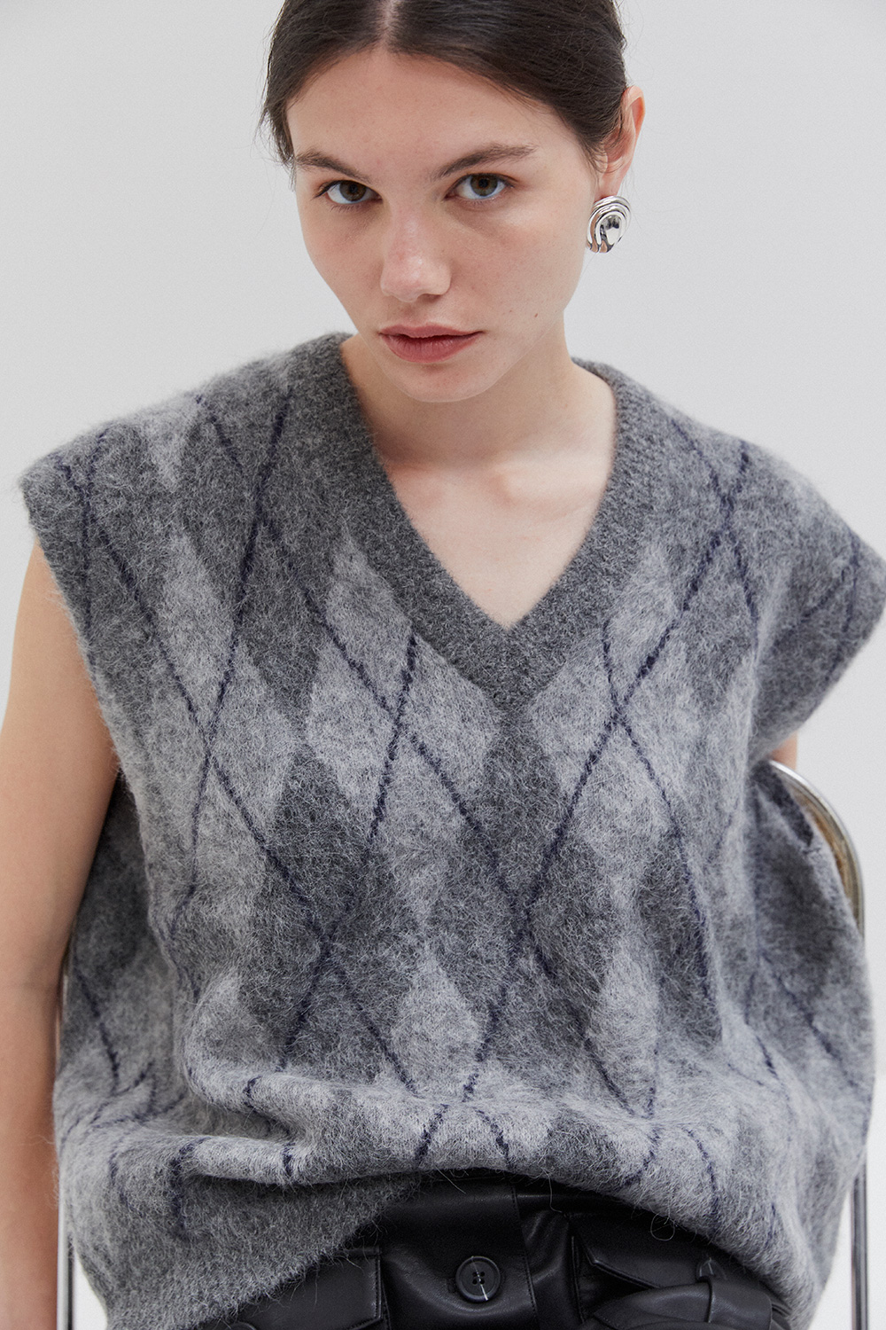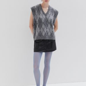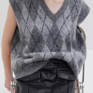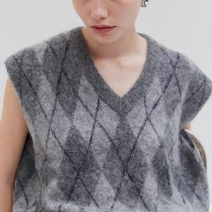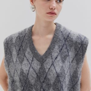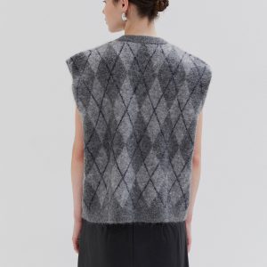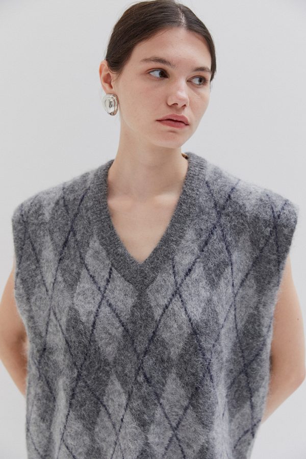 Sleeveless knit vest in soft fabric with argyle pattern. Designed with a V-neckline and relaxed fit, perfect for layering.