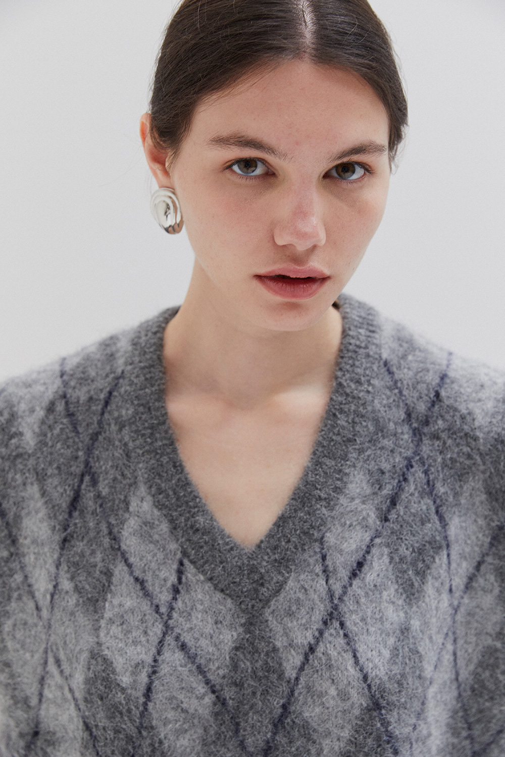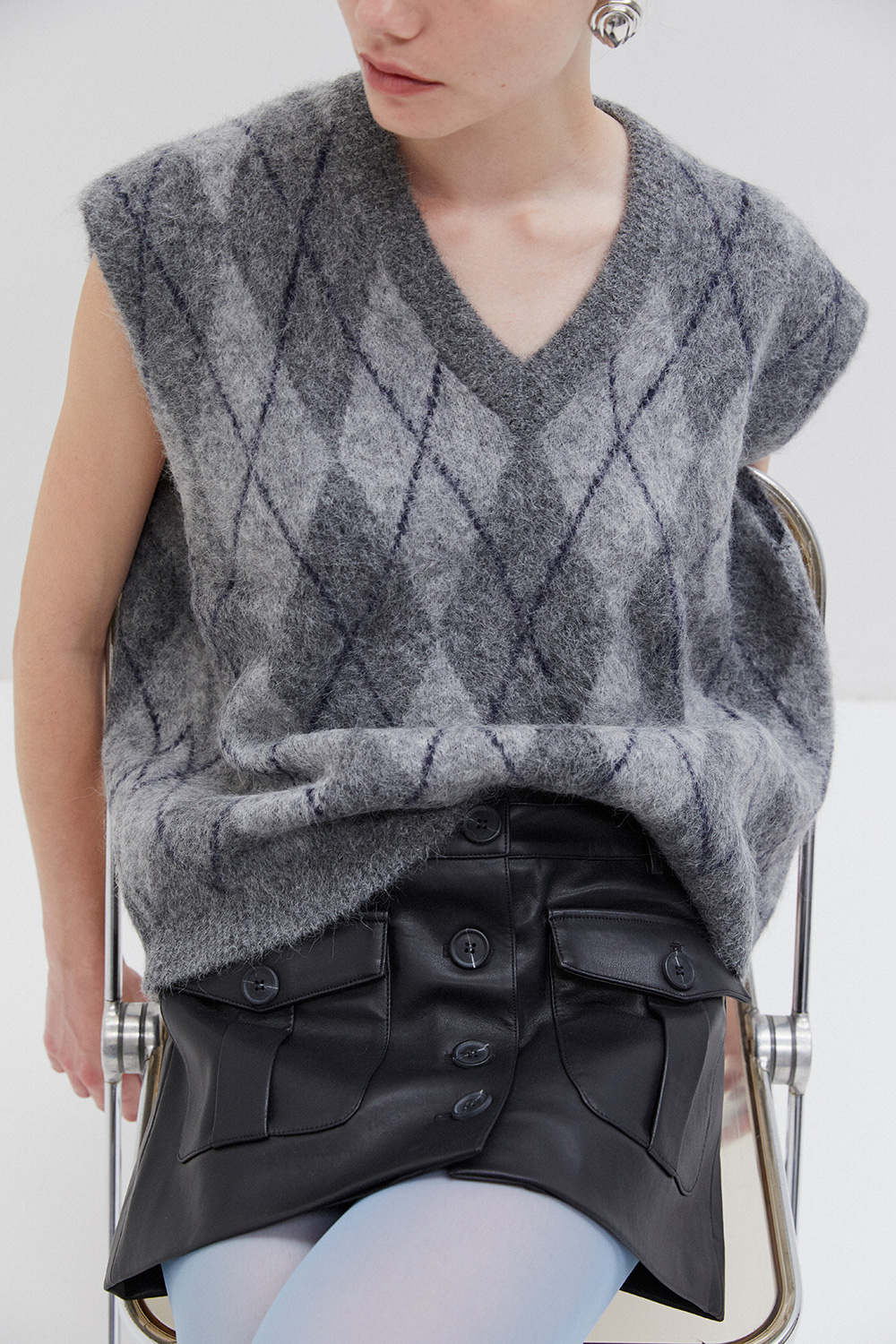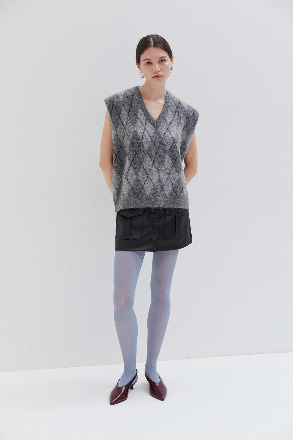 Sleeveless knit vest in soft fabric with argyle pattern. Designed with a V-neckline and relaxed fit, perfect for layering.