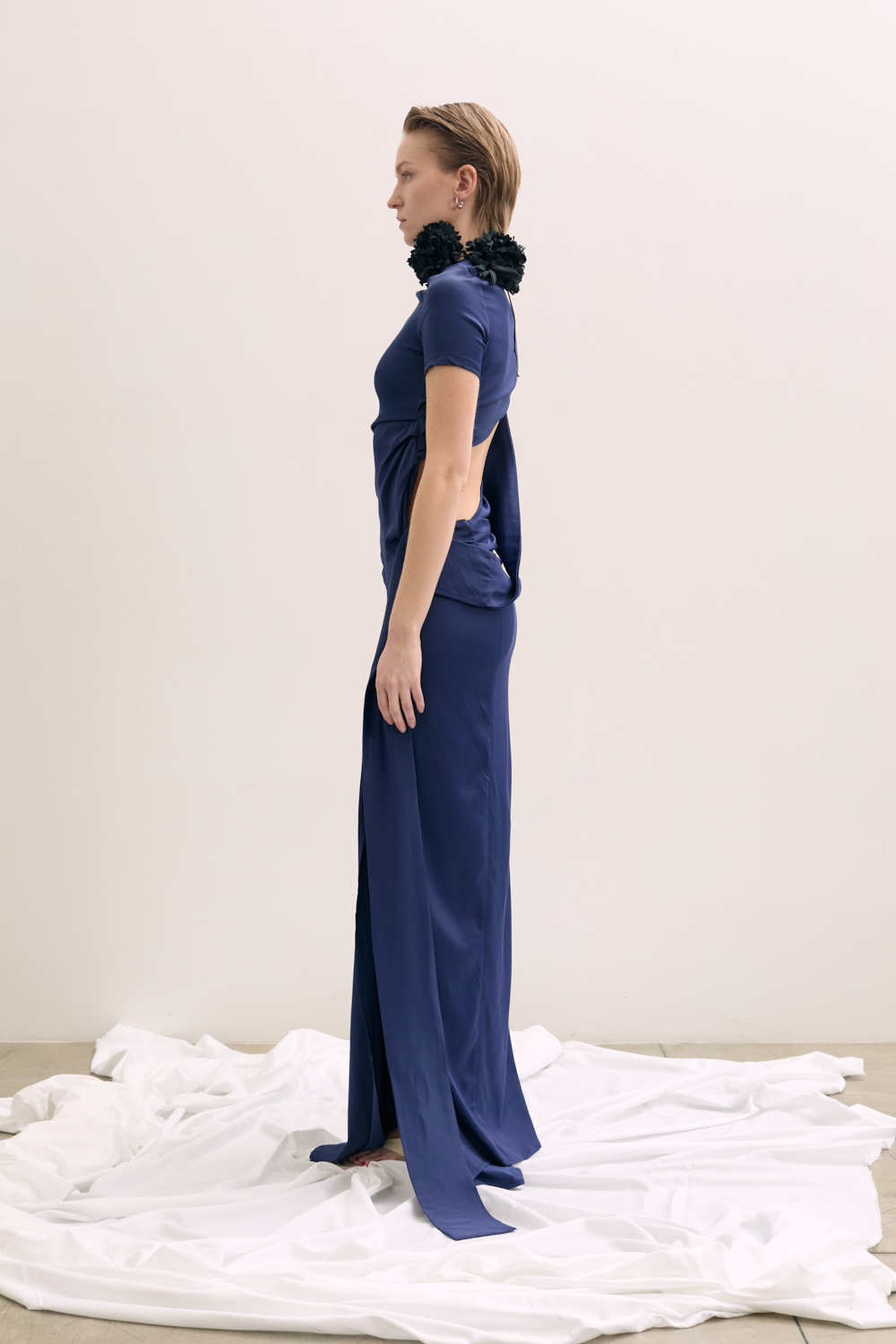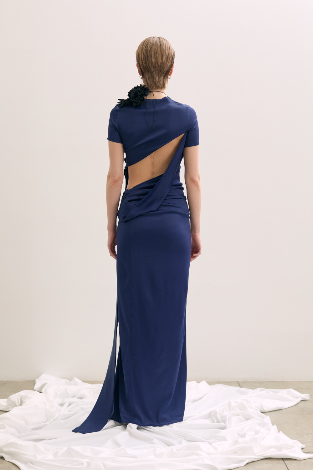 Long dress made from slightly satin navy blue viscose fabric with stretch, allowing the garment to fit perfectly to the body. The dress has a cutout that runs diagonally across the back and a ribbon that falls at the front, adding movement to the garment.
