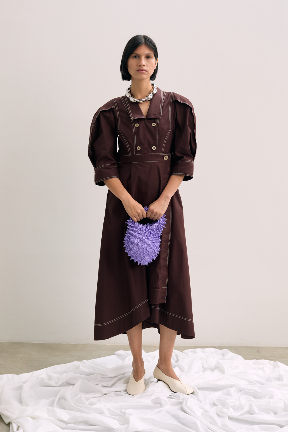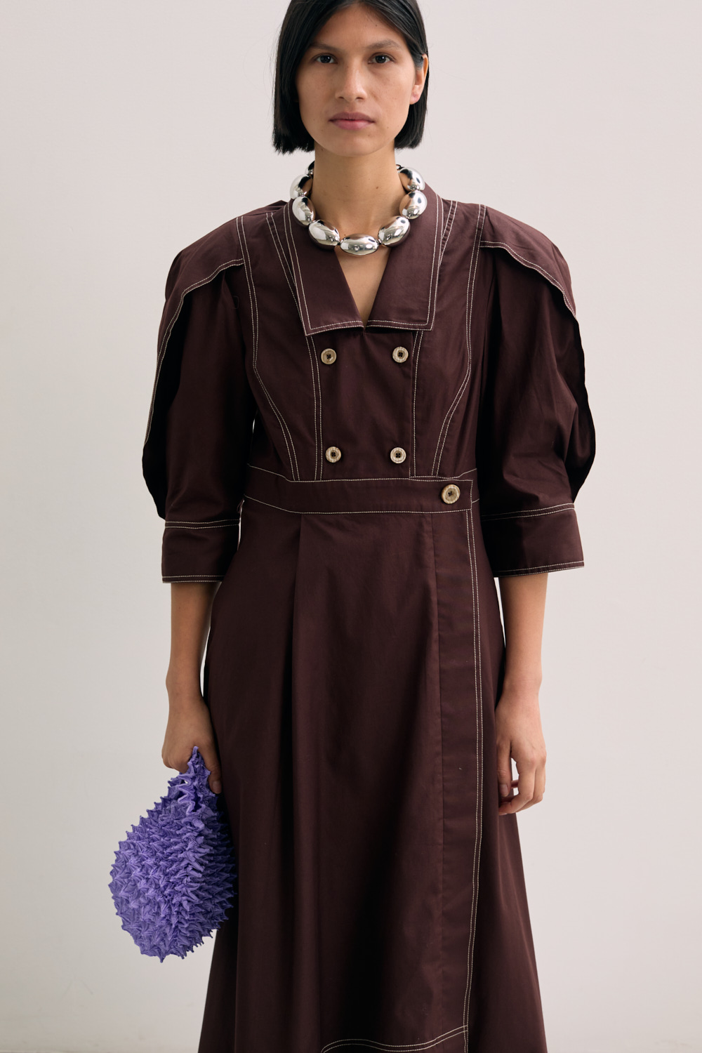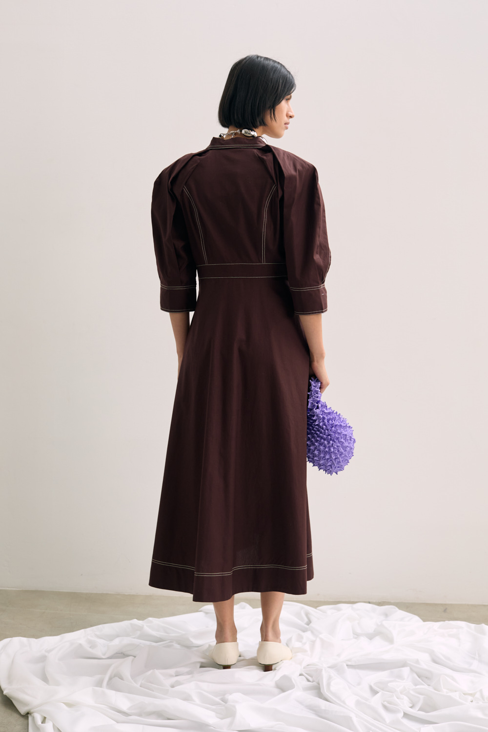 This dress blends utilitarian edge with feminine grace. The contrast topstitching and structured silhouette elevate this midi into a standout piece that transitions seamlessly from day to evening. Ideal for making a polished statement with minimal effort.