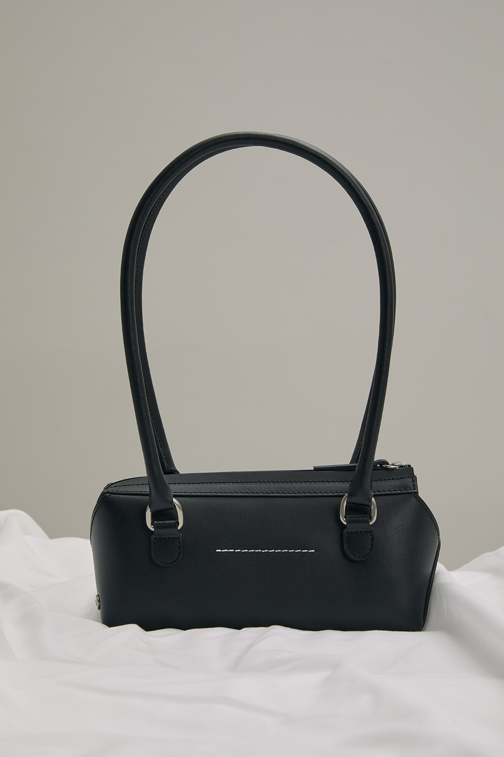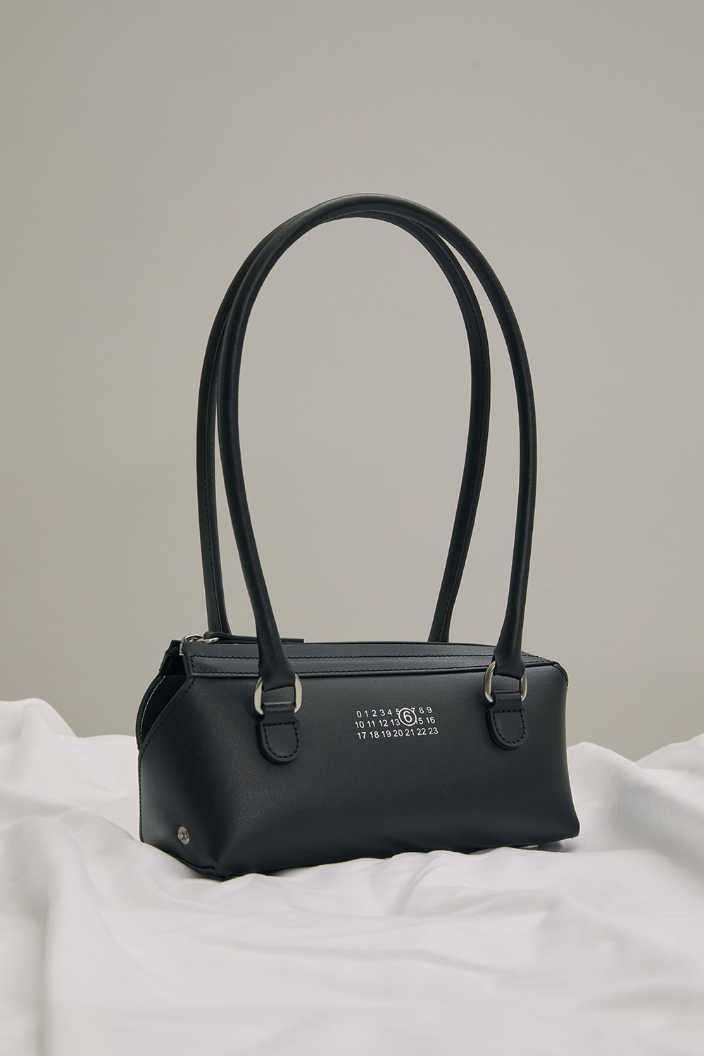 A streamlined interpretation of the bowling bag, defined by its horizontal proportions and smooth leather construction. The design is pared back to essentials, with a zip-top opening and slender handles for easy carry. Finished with the MM6 numeric artwork at the front.