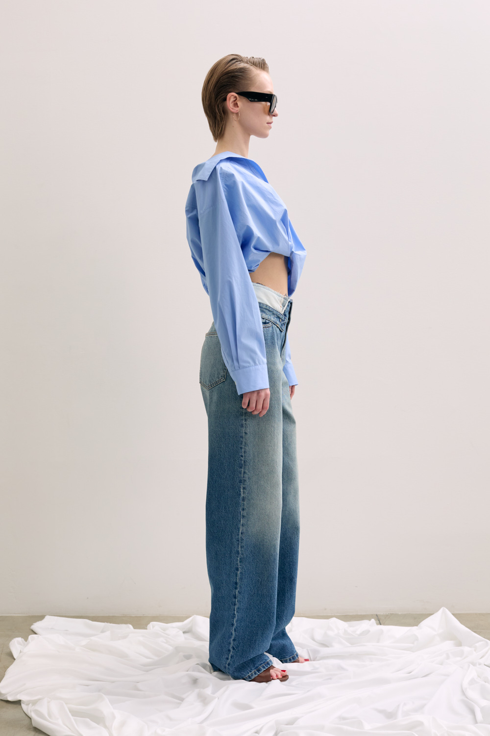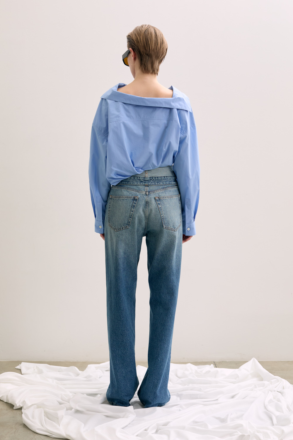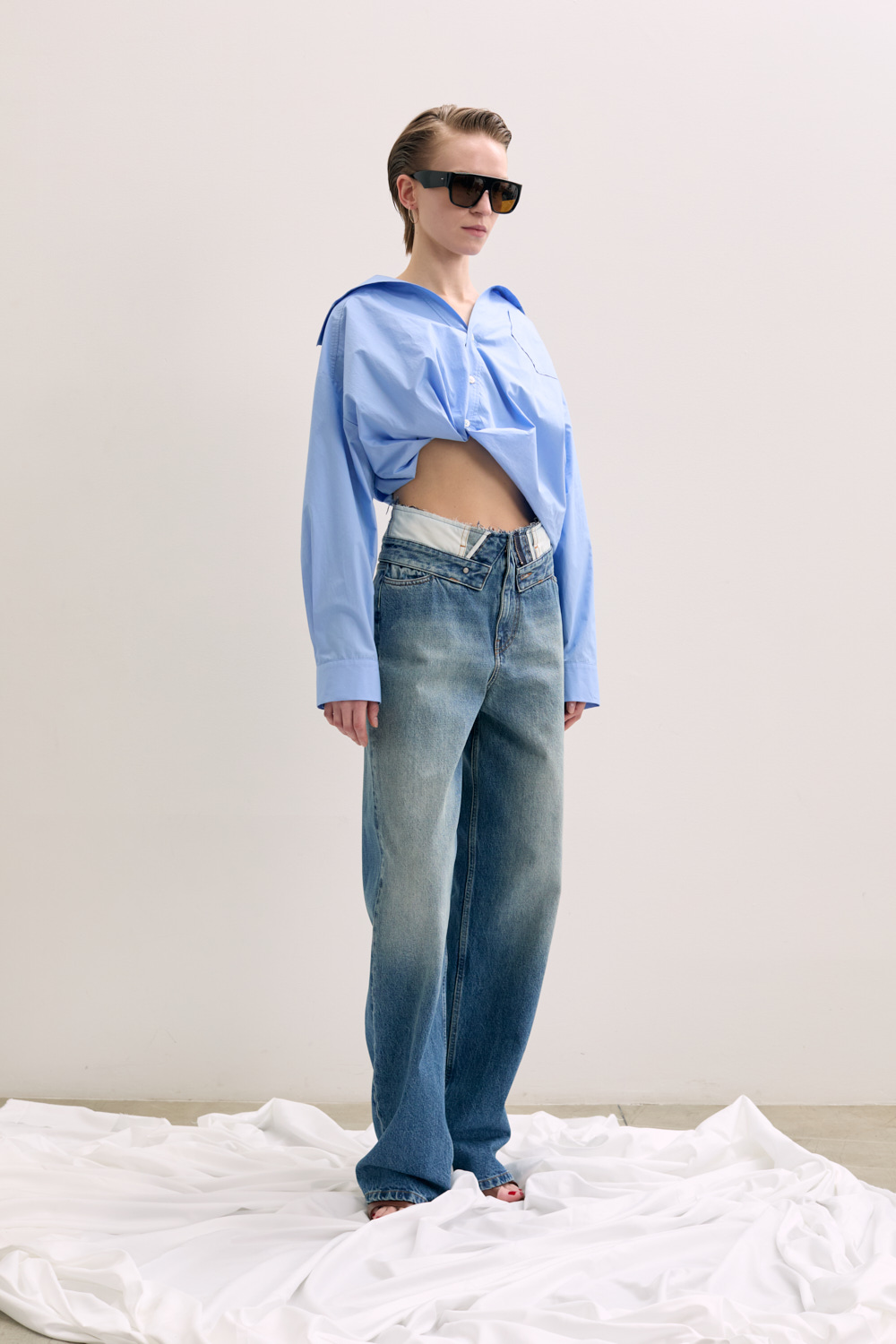 · Frayed edge at mock foldover waistband