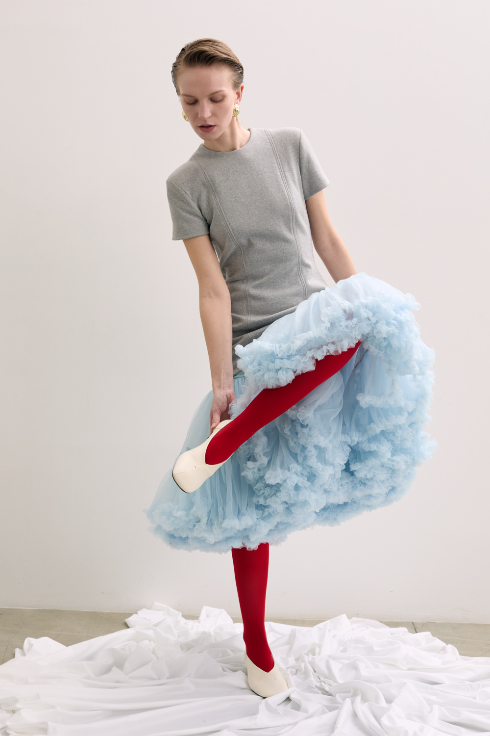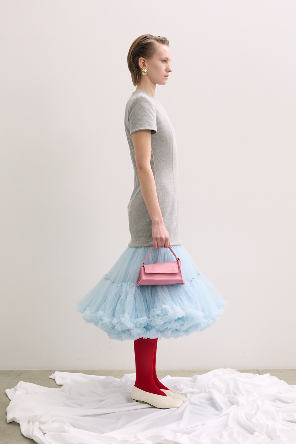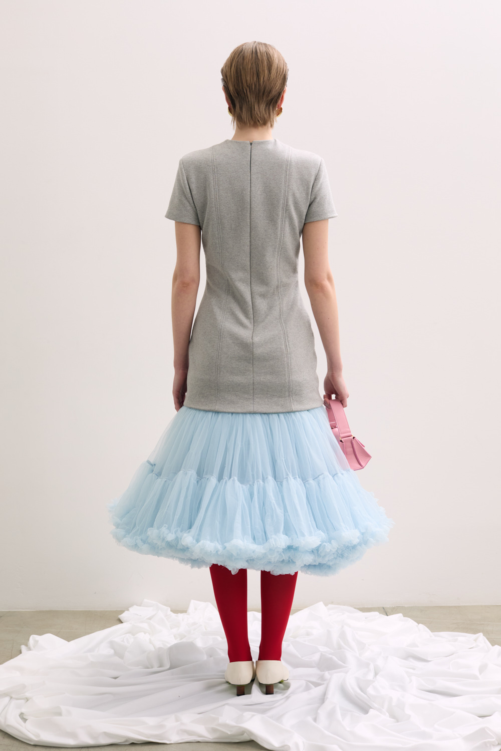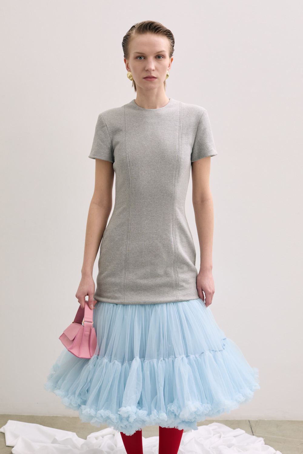 SHORT SLEEVED DRESS WITH A FITTED BODICE AND A VOLUMINOUS TULLE UNDERSKIRT