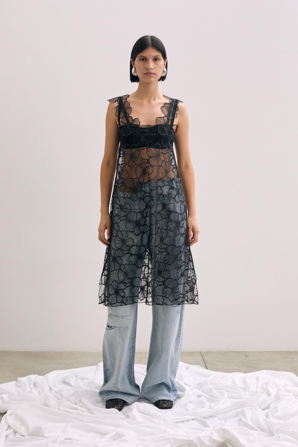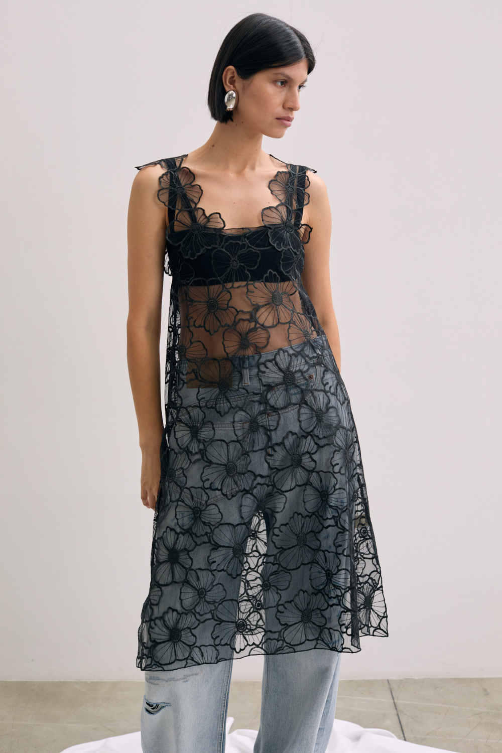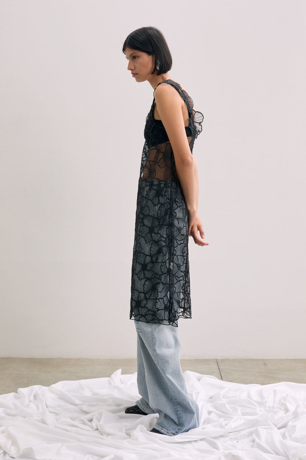 The Iris Dress is crafted from 90% recycled polyamide and 10% recycled polyester. Designed in sheer black floral lace, it features delicate straps, a loose fit, and a below-the-knee length. Lightweight and versatile, it can be styled alone or layered over trousers and skirts for a bold, modern look.