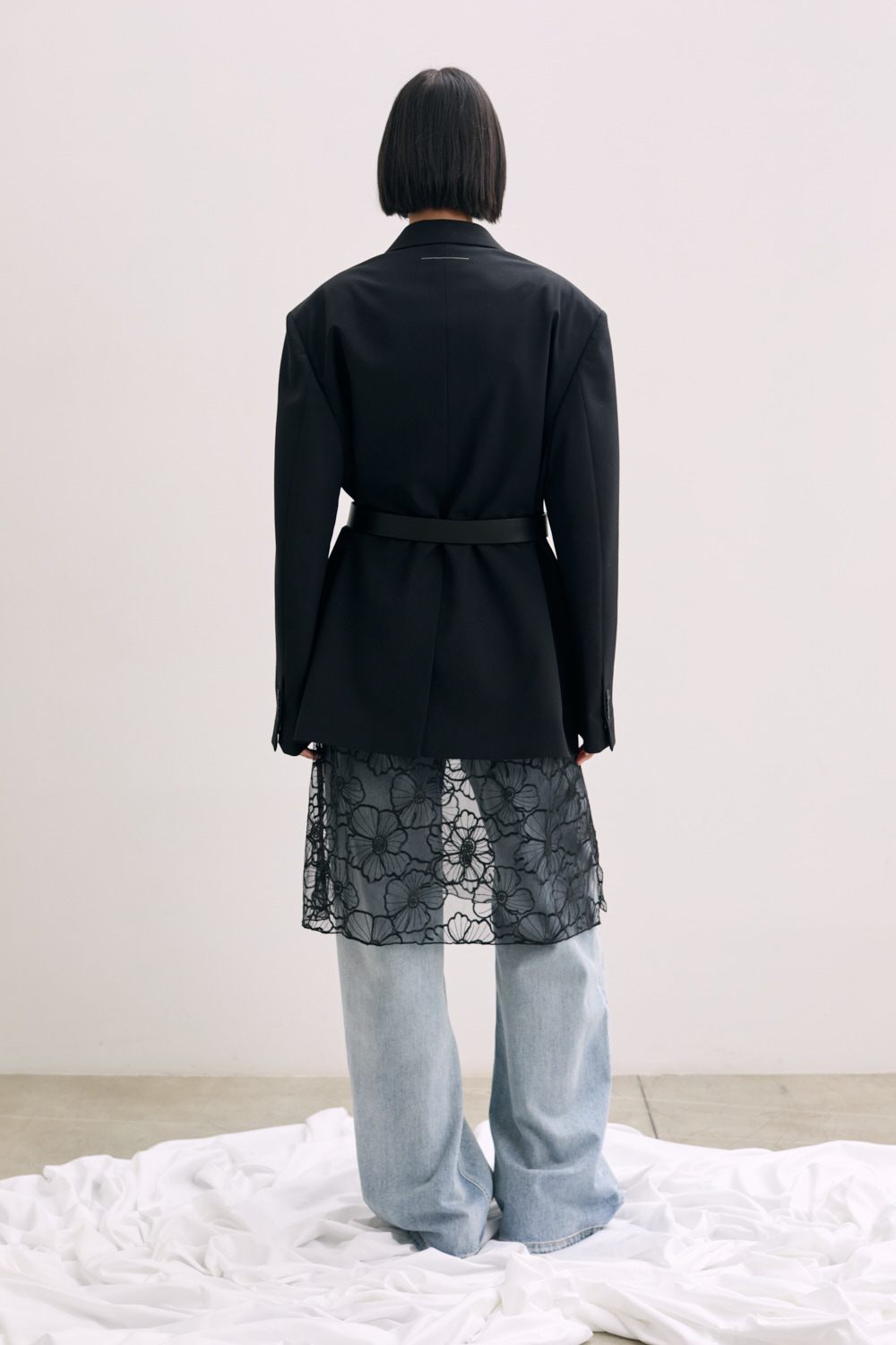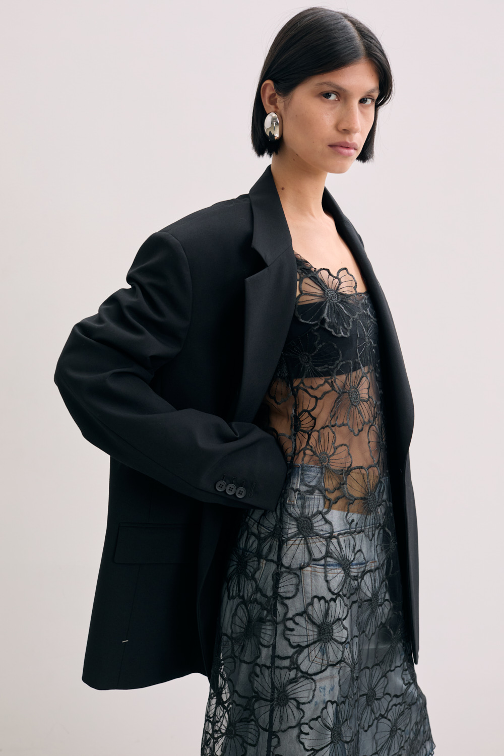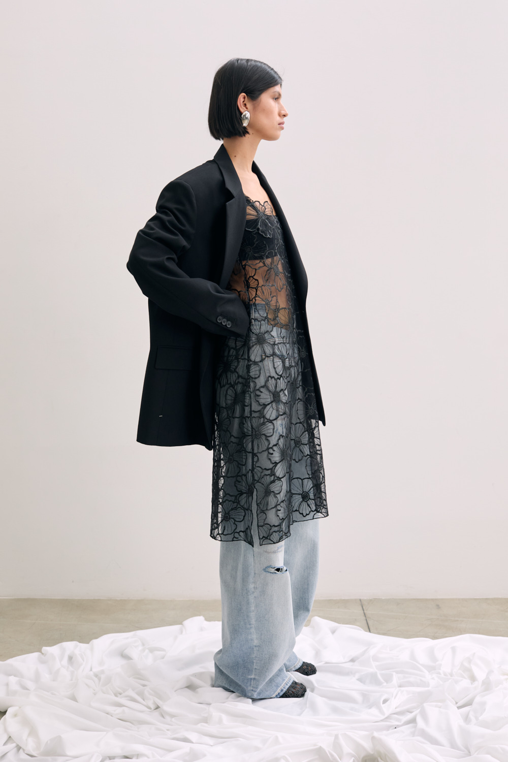 The Iris Dress is crafted from 90% recycled polyamide and 10% recycled polyester. Designed in sheer black floral lace, it features delicate straps, a loose fit, and a below-the-knee length. Lightweight and versatile, it can be styled alone or layered over trousers and skirts for a bold, modern look.