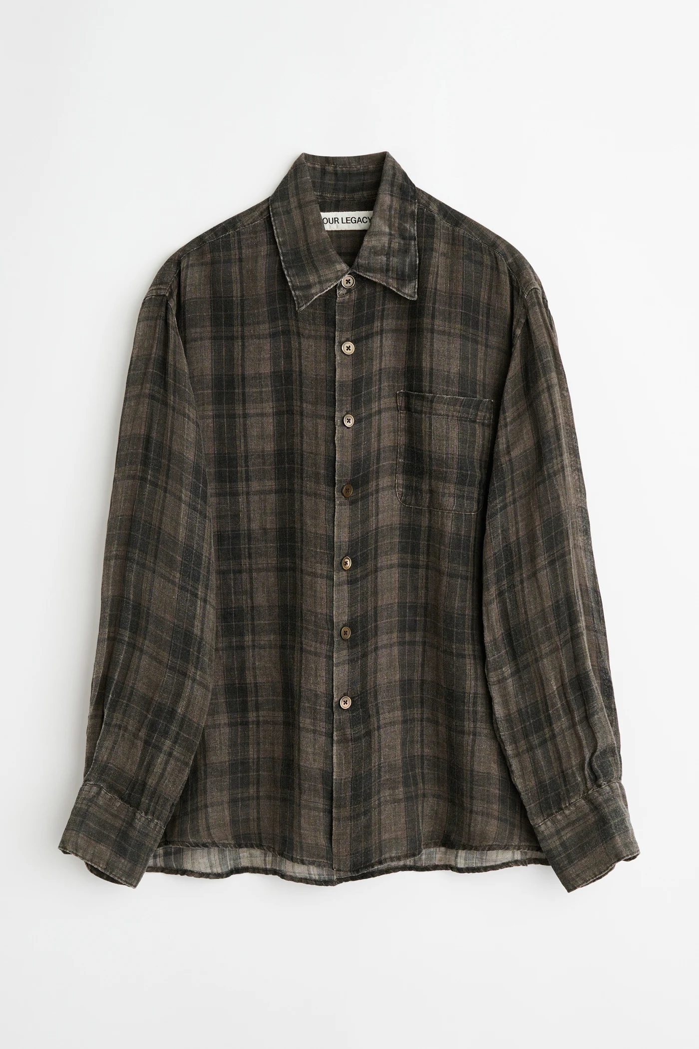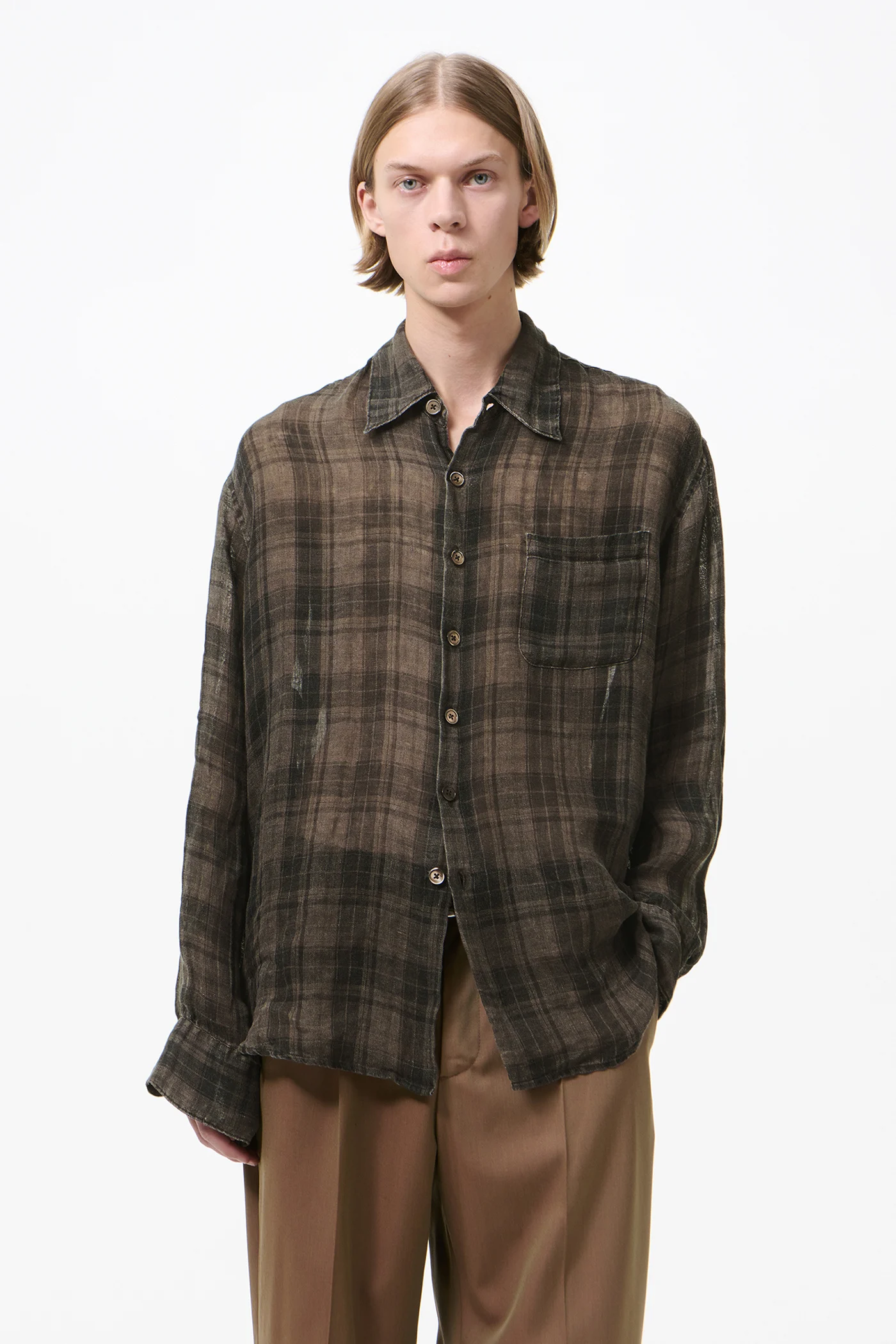 Produced in Italian linen with our Penumbra check. This fabric has been pigment coated and then washed out, creating a worn look with softened colors and a distinctive handfeel. This treatment gives each piece its own shade and character. The men’s Above Shirt has a slightly oversized fit and features a single chest pocket, mother of pearl buttons, OL embroidery, a curved hem and mitered cuffs.