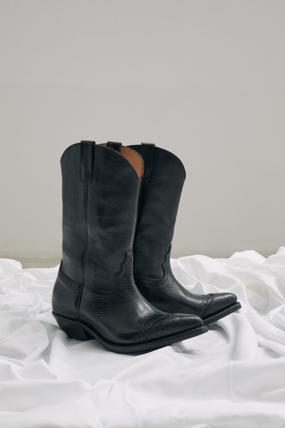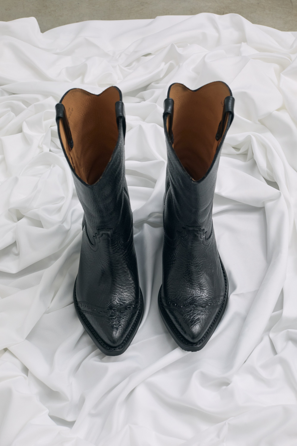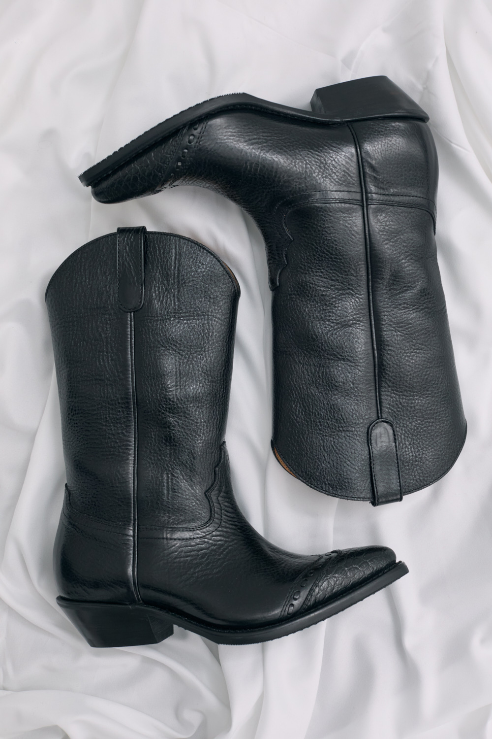 Our Legacy Consultant Boot in Deep Black Leather. Produced in Italian vegetable-tanned full grain cow leather, the Consultant Boot features hand-made stitching along the toe cap, classic cowboy cutlines, a fitted last with a wider, angled shaft, and a 5 cm high heel.