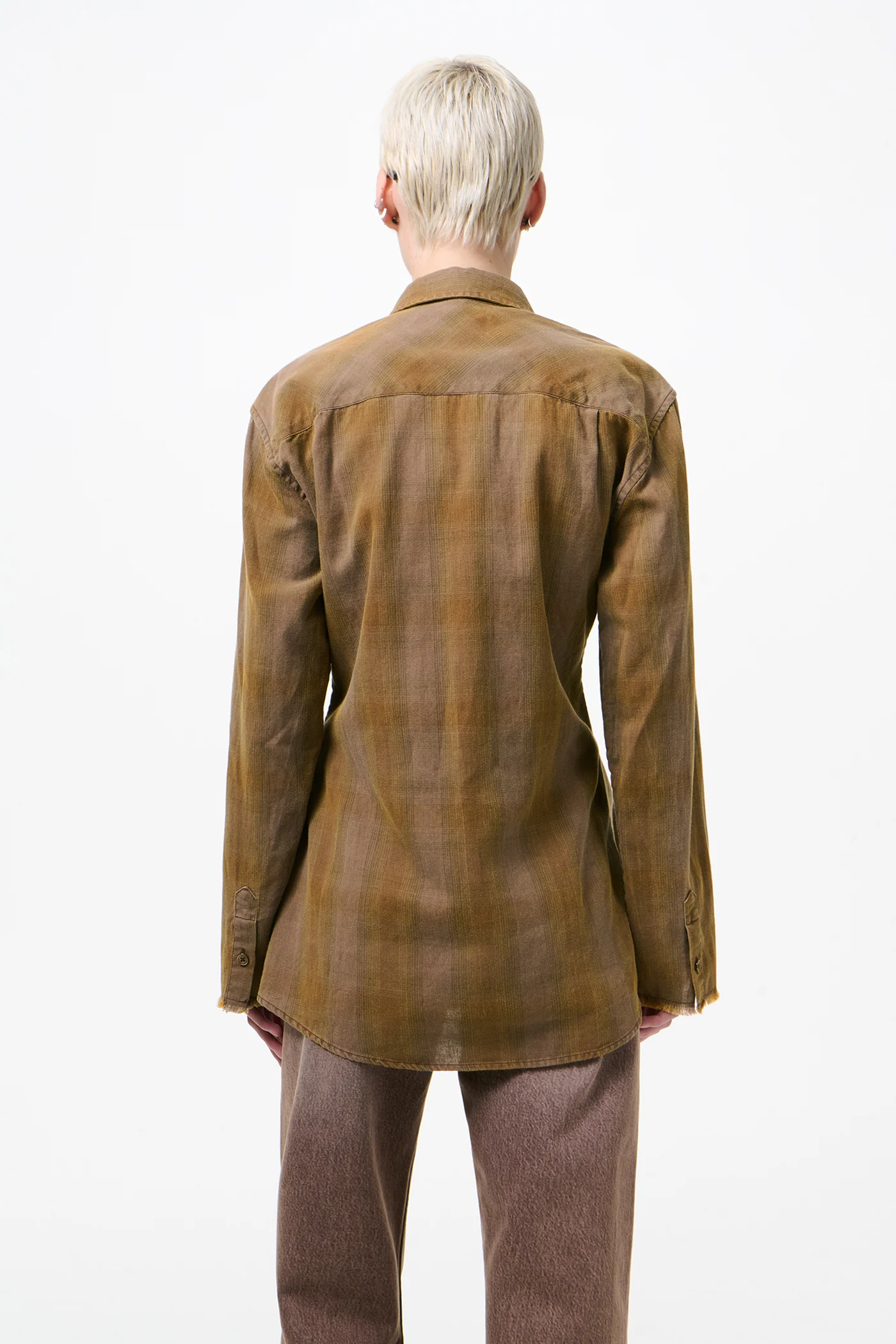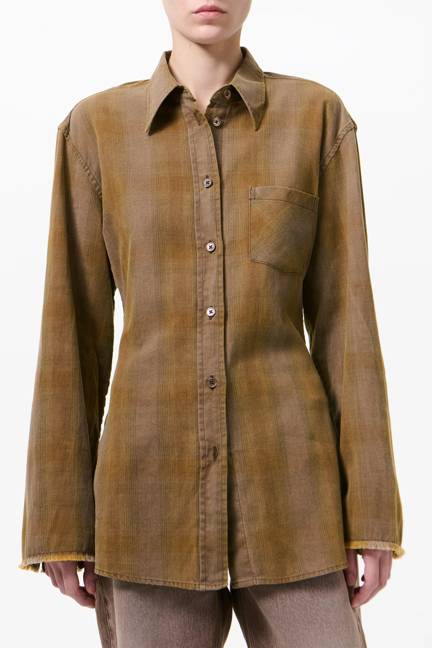 roduced in a pigment coated Portuguese cotton flannel woven in a durable twill with a classic check, the Daisy Shirt has a regular, darted fit and features a peaked lapel, mother of pearl buttons, a single chest pocket and a curved hem.