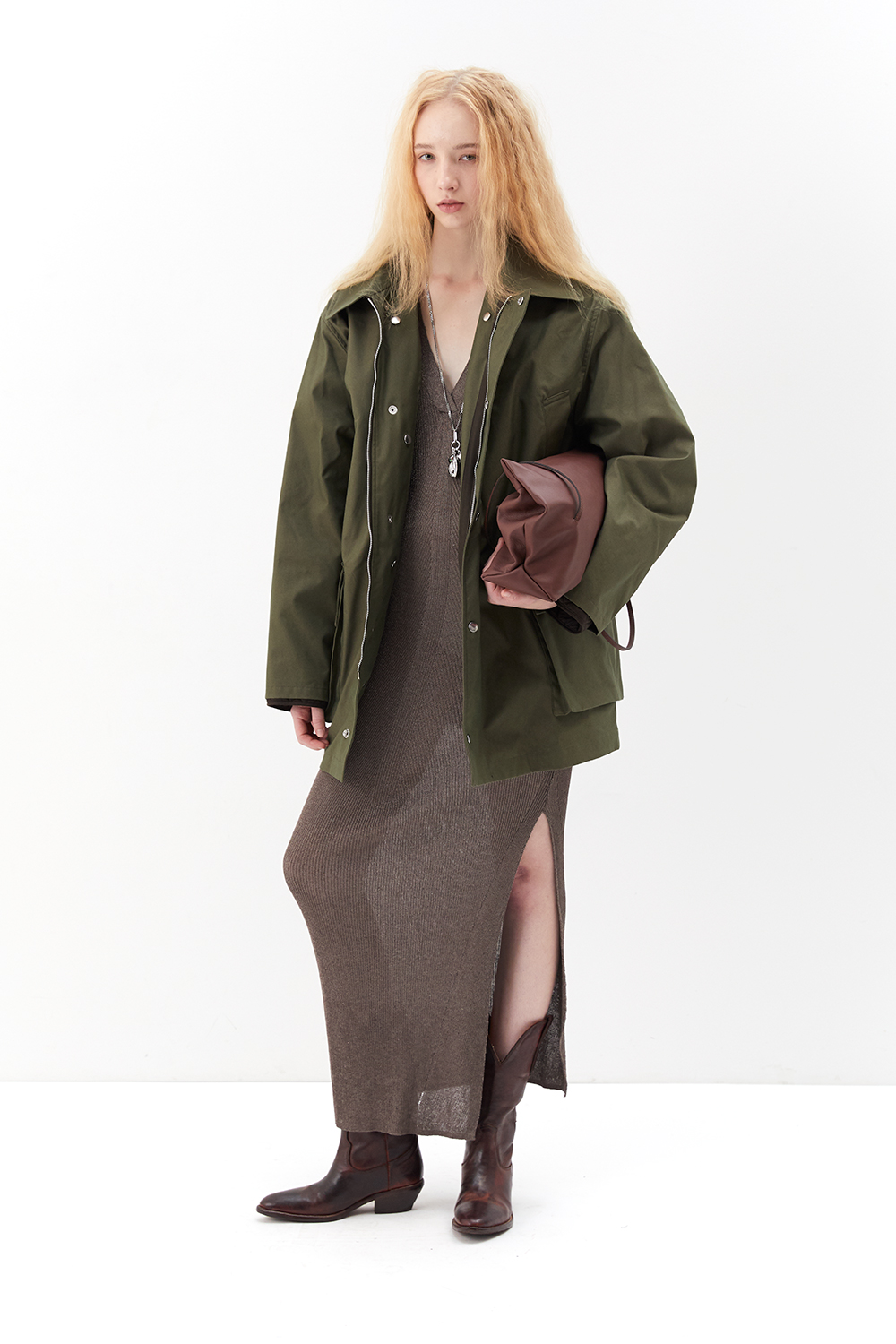Our Hunter Jacket in Pine Green Technical Panama. Produced in Italian cotton and polyester half Panama canvas inspired by vintage military garments, the men’s Hunter Jacket has a boxy, oversized fit and features a storm flap closure at the neck, a removable quilted lining that can be reversed and worn separately, a placket with metal snap closure, oversized patch pockets with gussets, an inner welt pocket and an OL bean rivet at the collar.