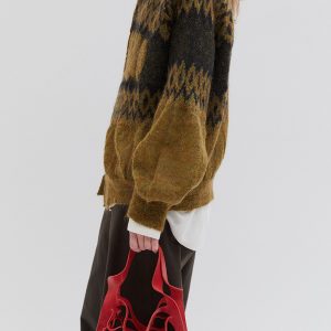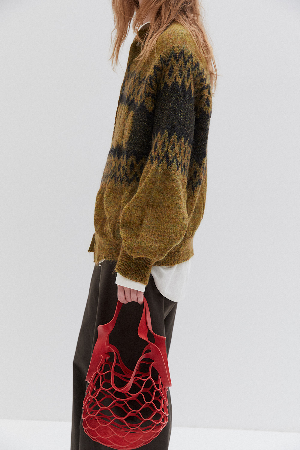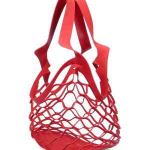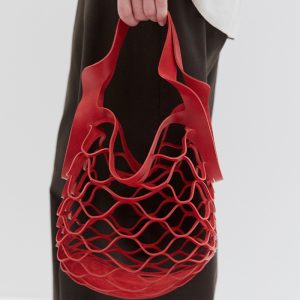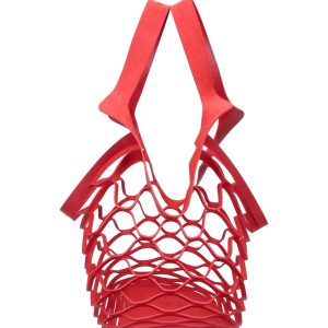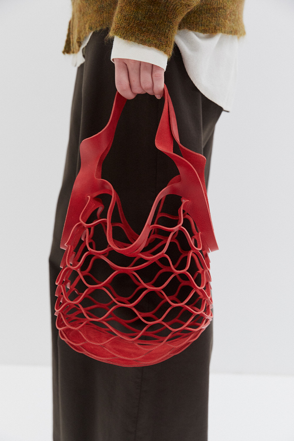 Our legacy ‘Shifting’ tote bag in red bull leather with two top handles, mesh pattern, foldable.