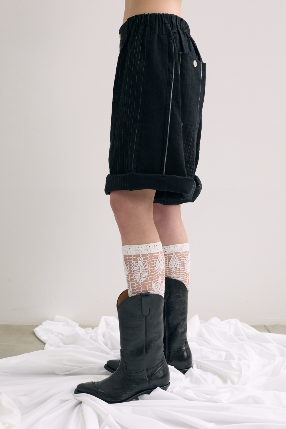 Bermuda in cotton/linen blend with cotton lace pocket detail.