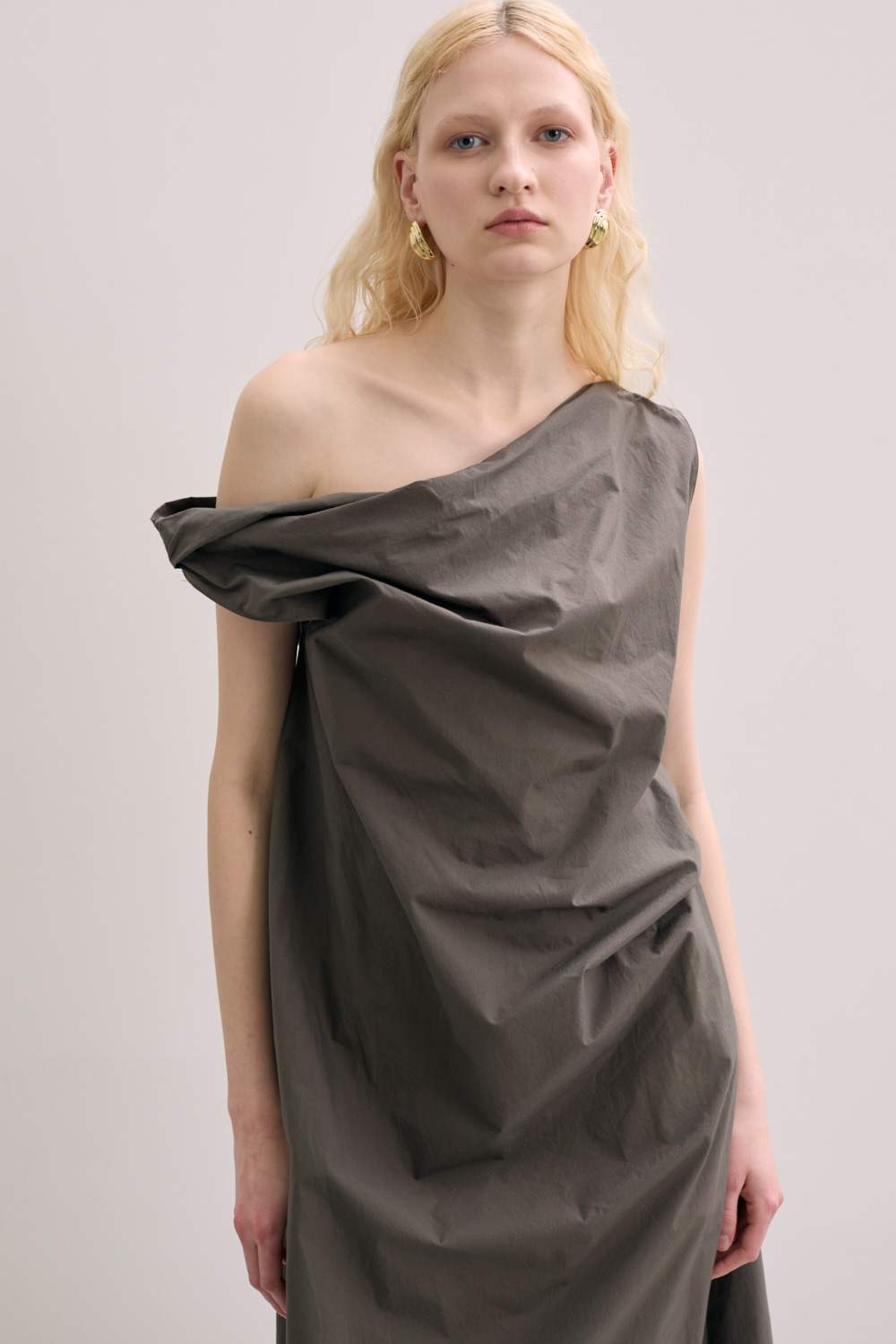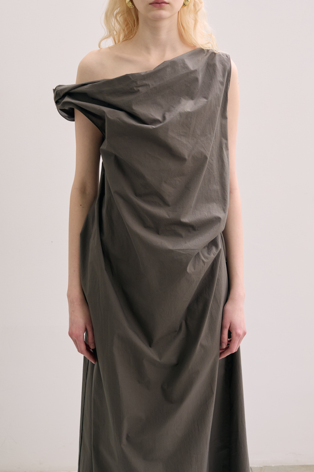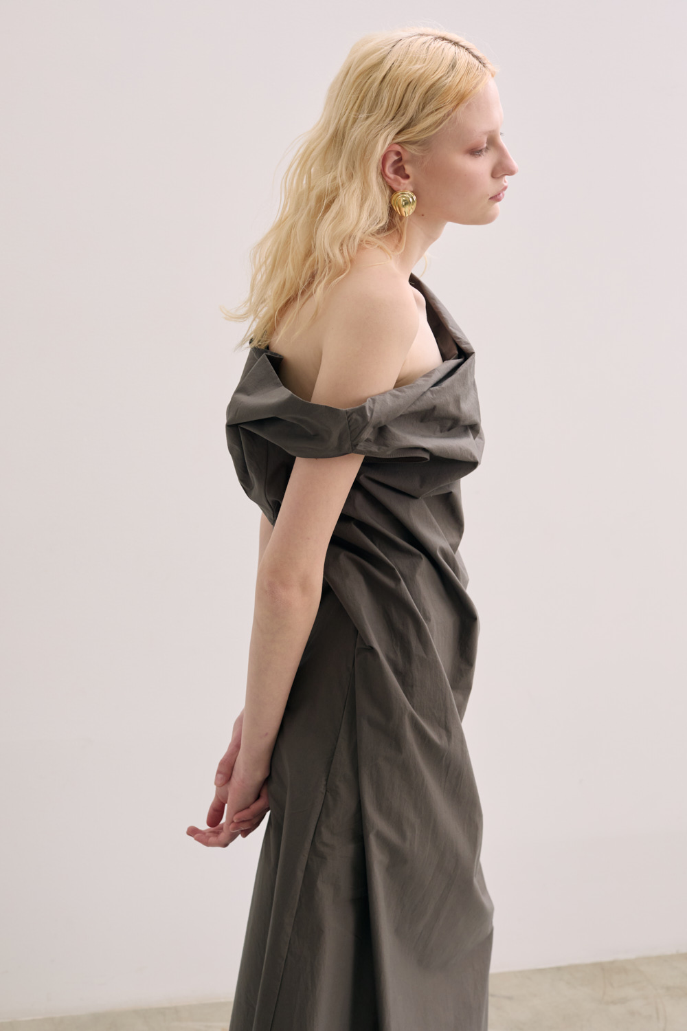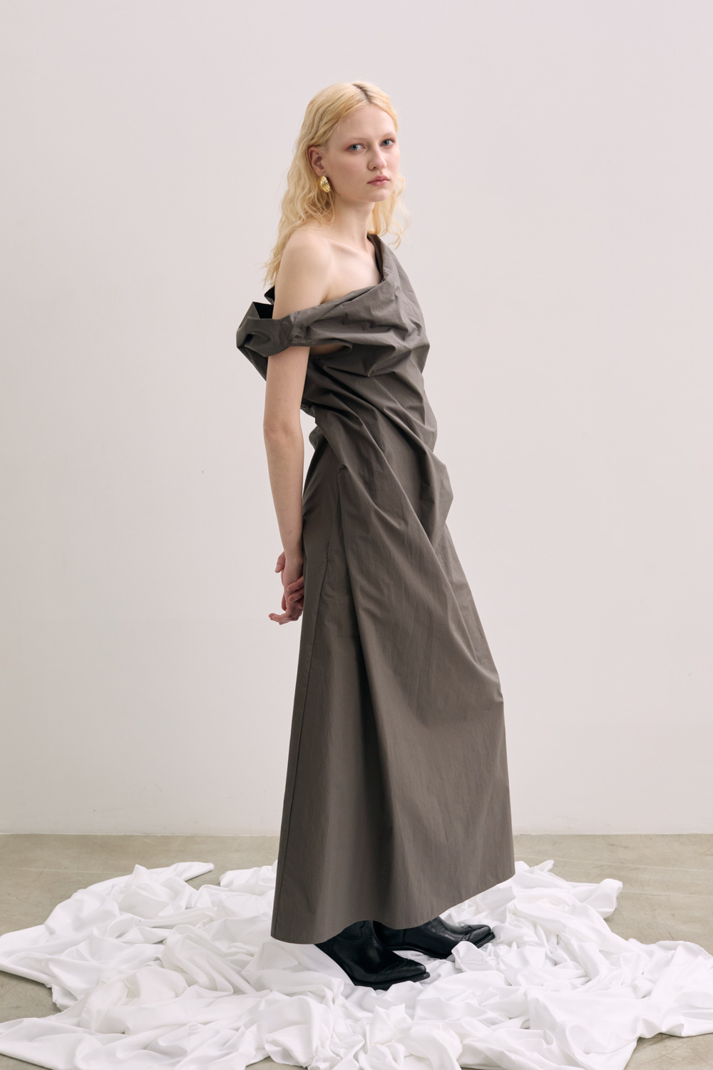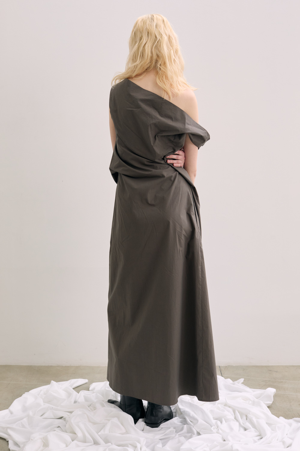 Long dress with strap inside for gather the fabric on the waist .