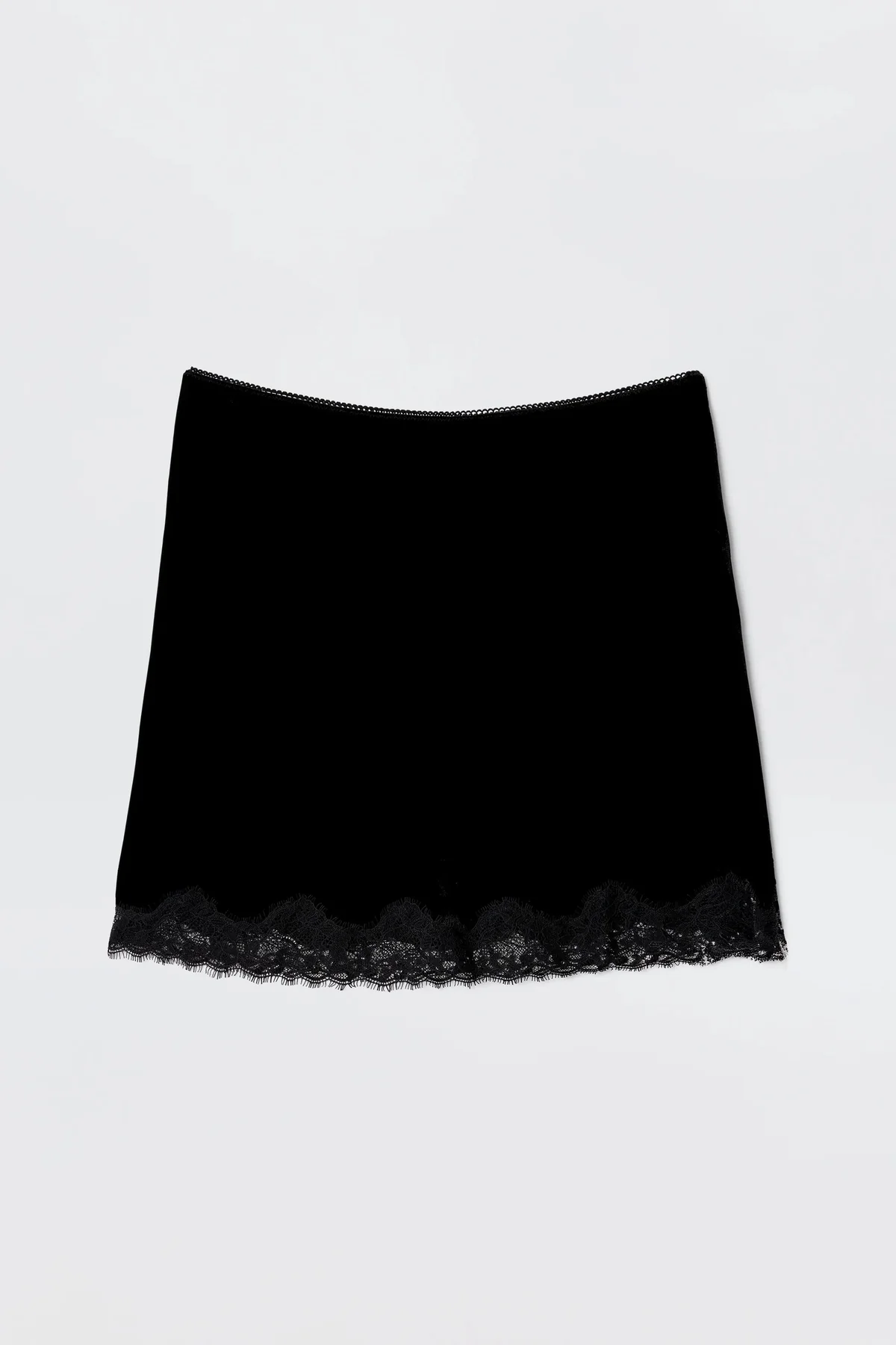 Capturing a nineties allure, our Kornelia skirt balances playfulness with sophistication and elegance. Crafted from a plush velvet and finished with a delicate lace trim it has a romantic feel while still feeling refined. Layer up as the colder months approach or dress down for summer fun it’s the ultimate mini skirt.
