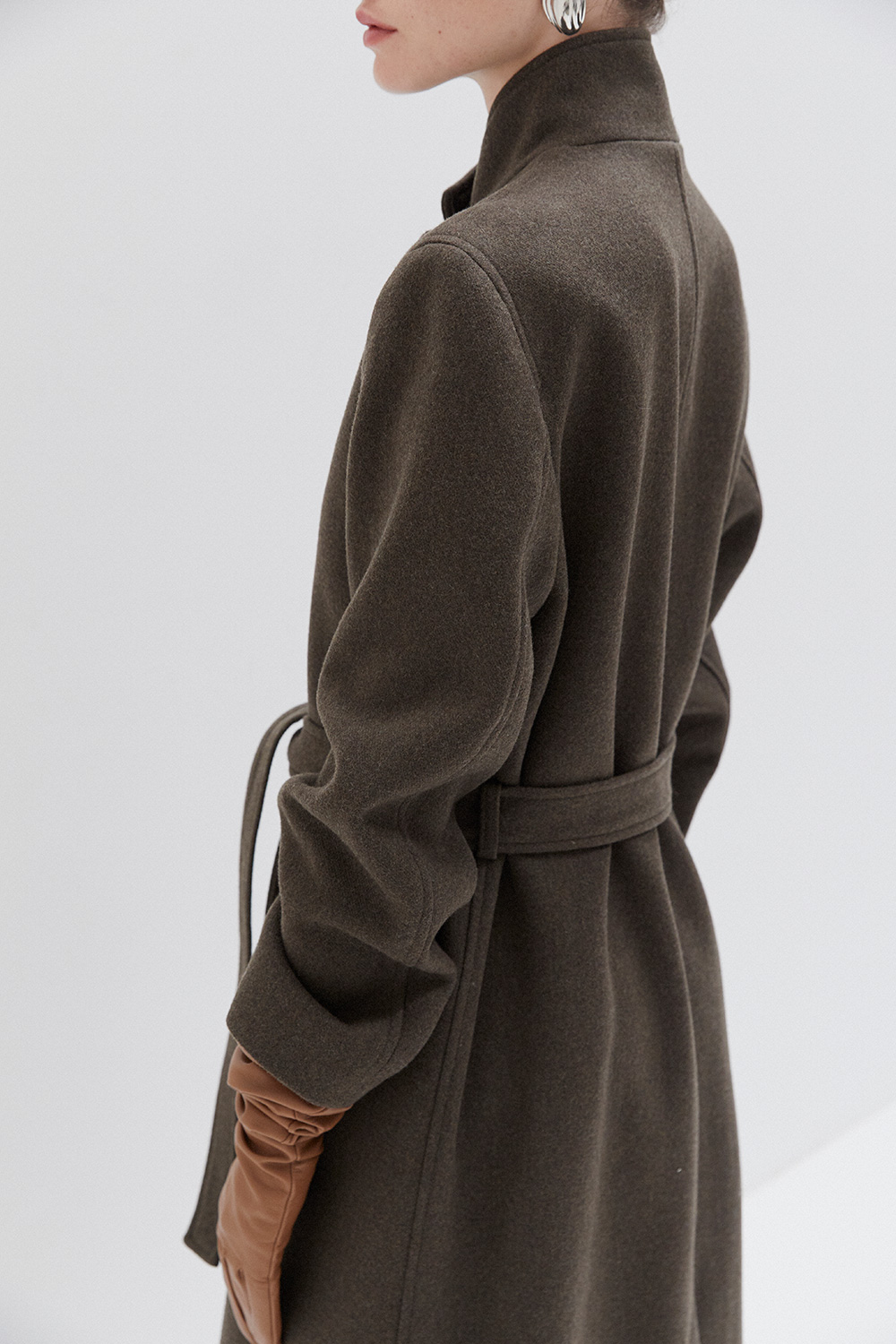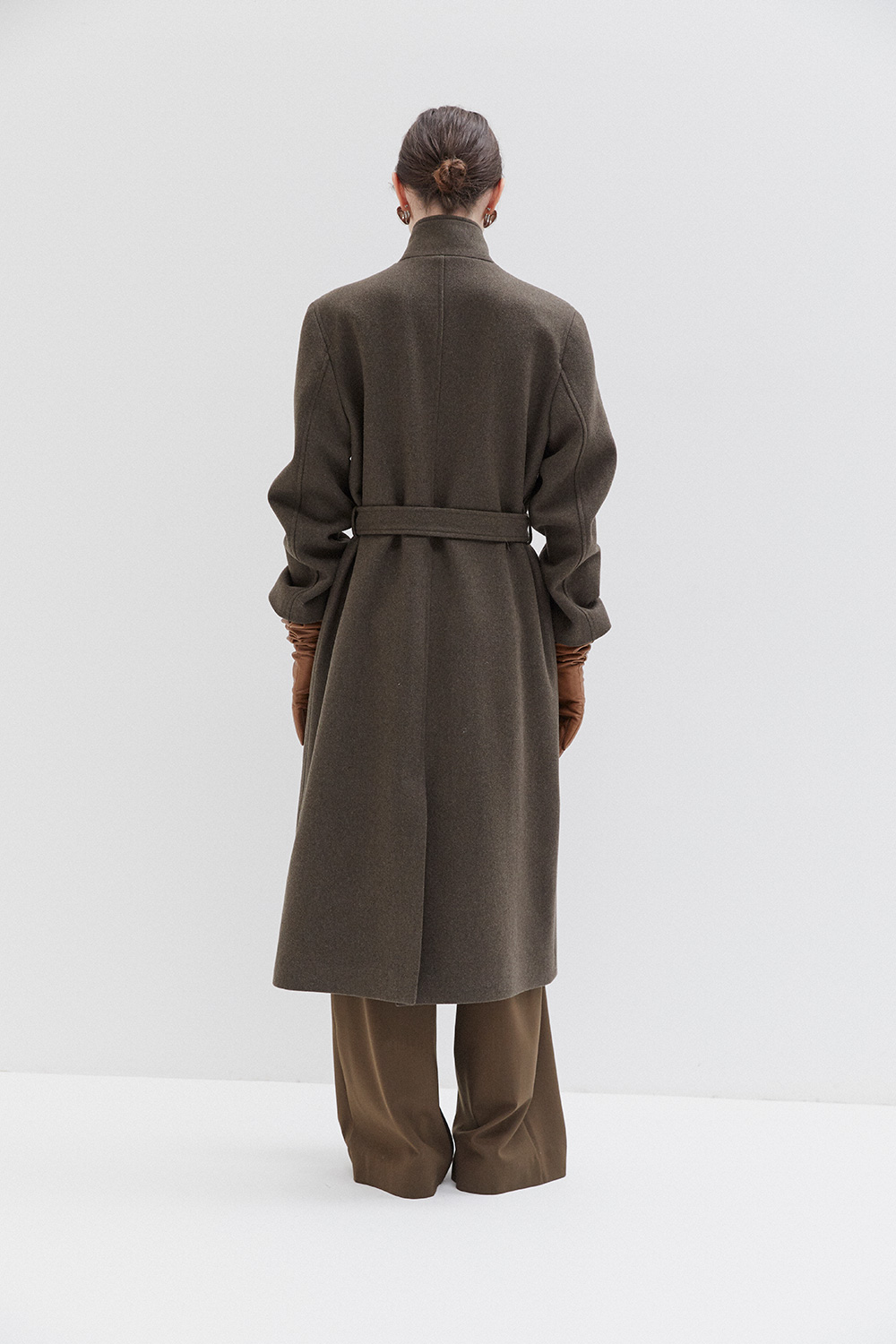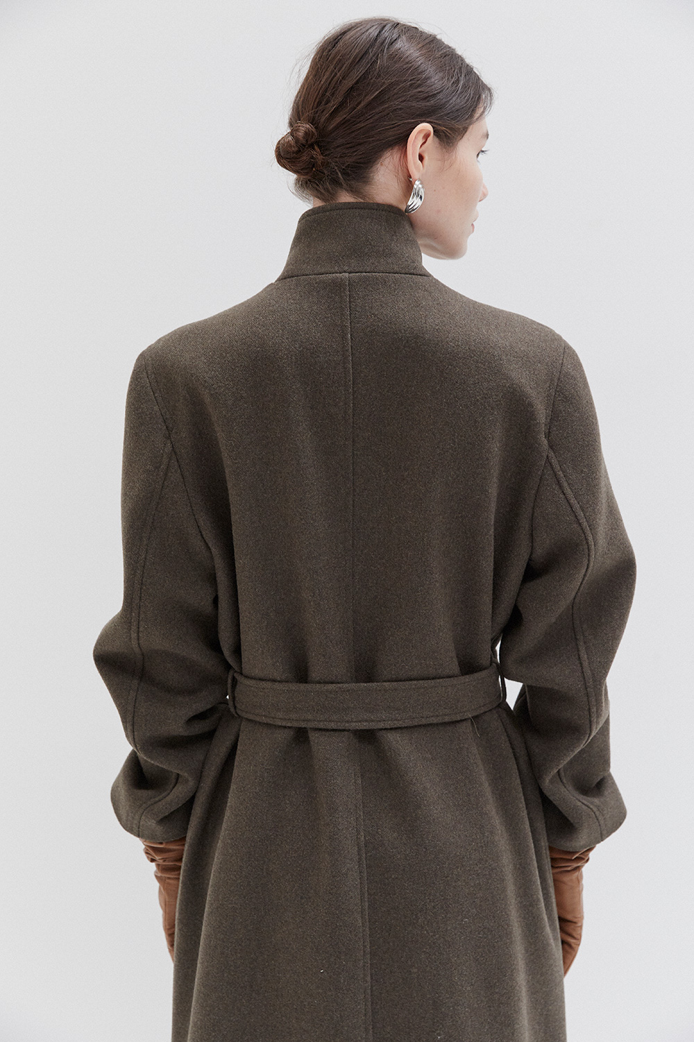A coat with quiet authority. This long winter layer combines generous shoulders and wide lapels—snapping into a stand collar—with a matching belt to shape the silhouette. In deep khaki green with brown flecks, the wool blend adds earthy richness and texture to a timeless, confident design.