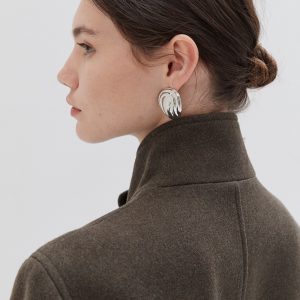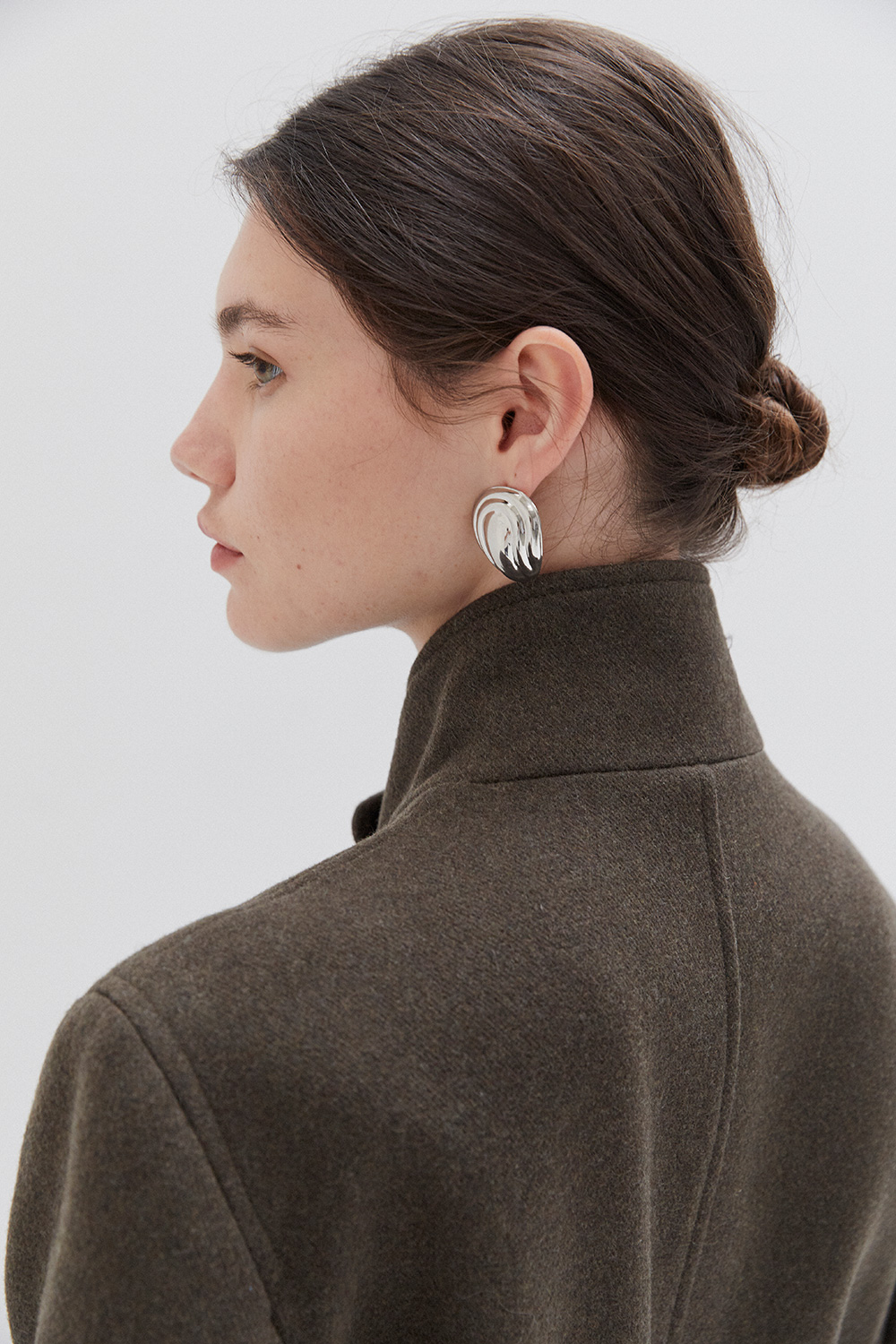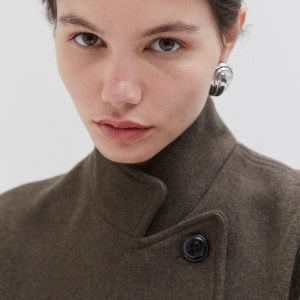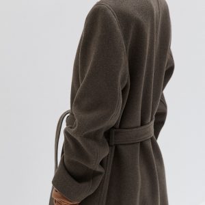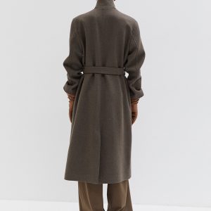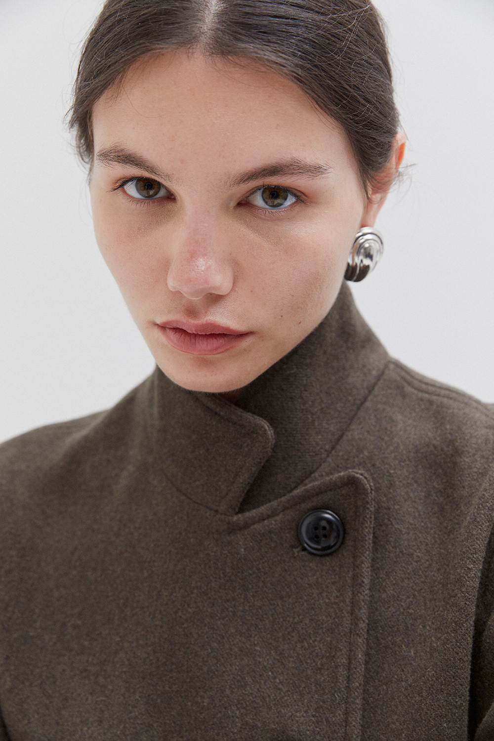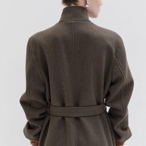 A coat with quiet authority. This long winter layer combines generous shoulders and wide lapels—snapping into a stand collar—with a matching belt to shape the silhouette. In deep khaki green with brown flecks, the wool blend adds earthy richness and texture to a timeless, confident design.