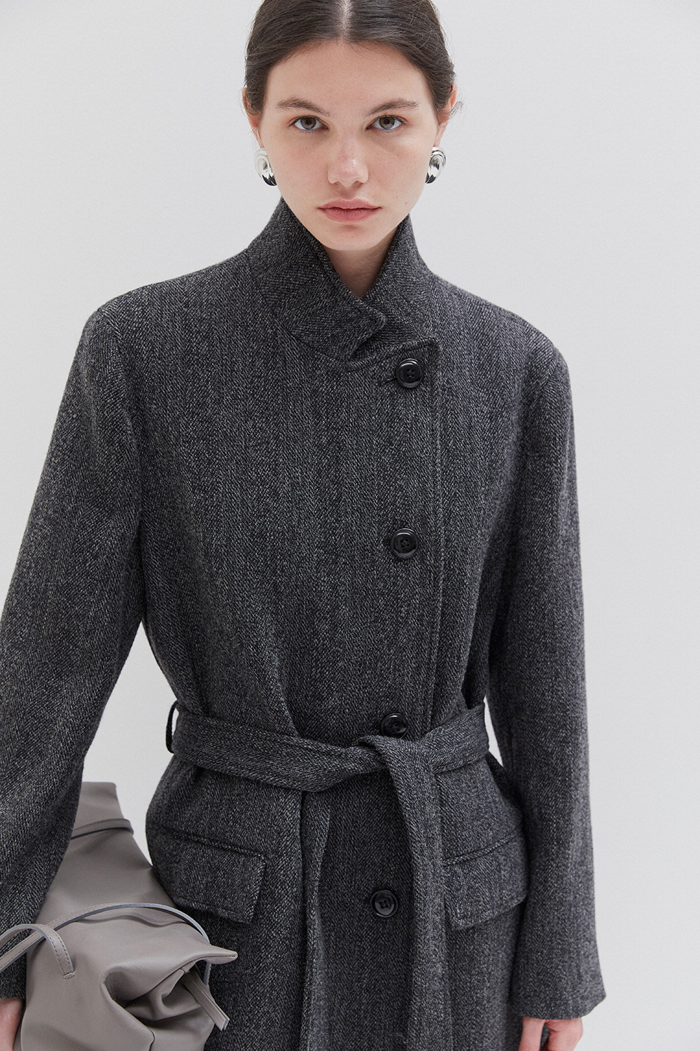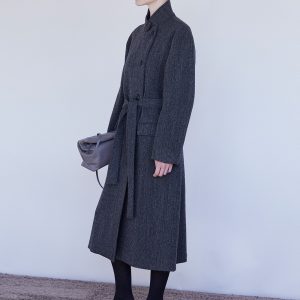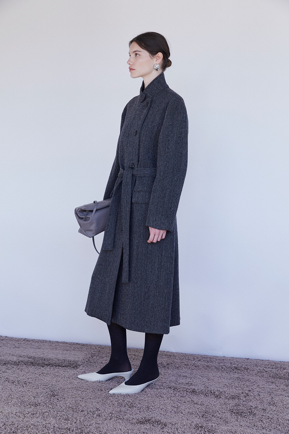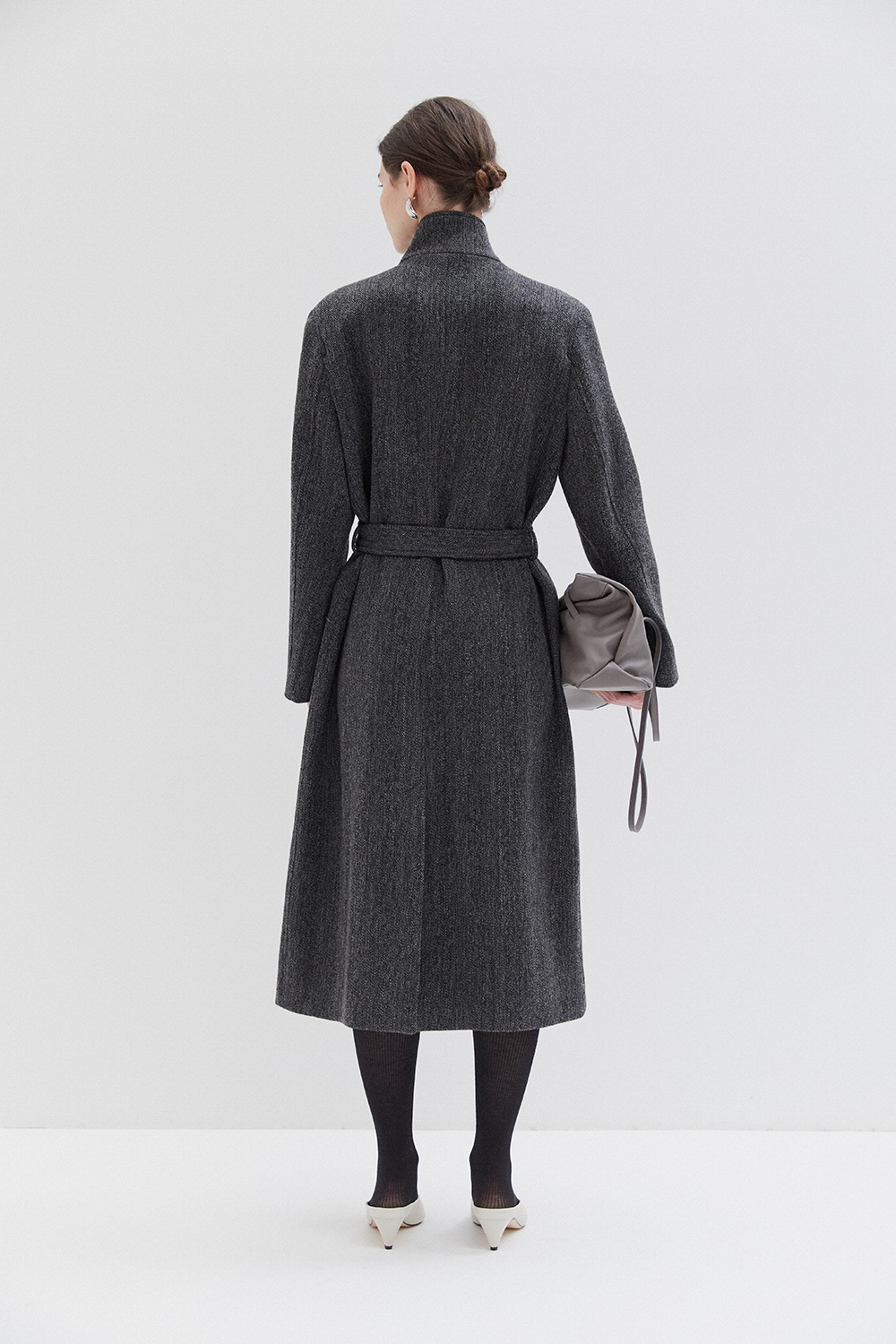 A coat that speaks in calm confidence. This long winter layer features generous shoulders, large lapels that close into a stand collar, and a matching belt for effortless waist definition. Made from a warm grey wool blend with a modern tweed effect, its subtly rustic texture channels a mature, contemporary take on countryside elegance.