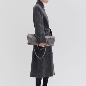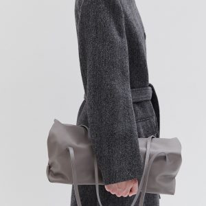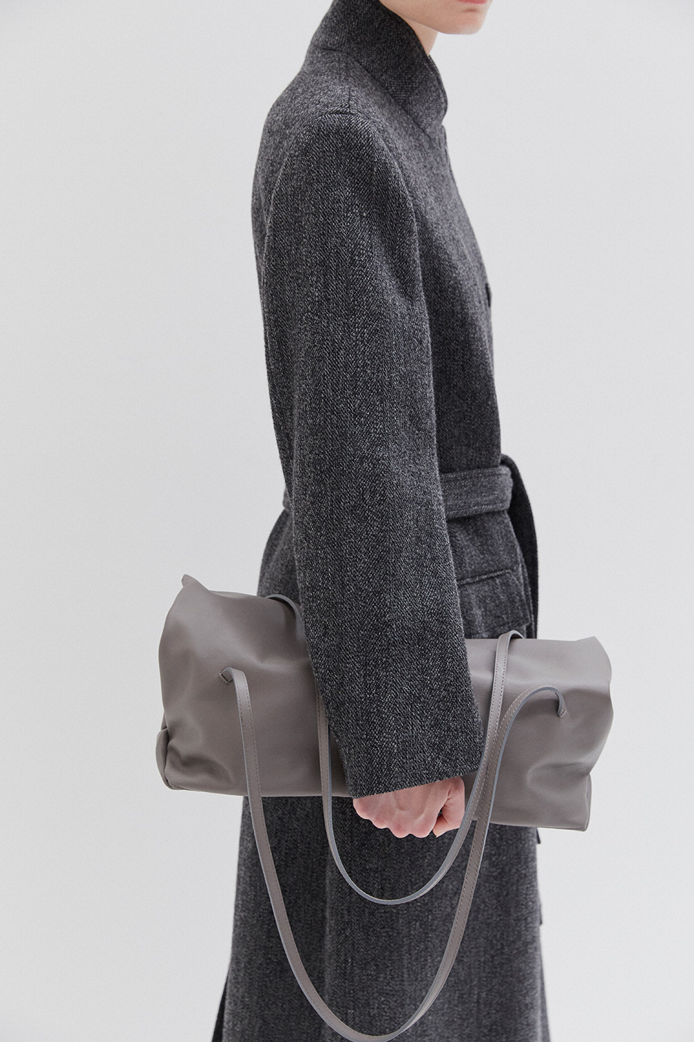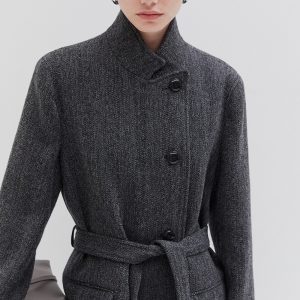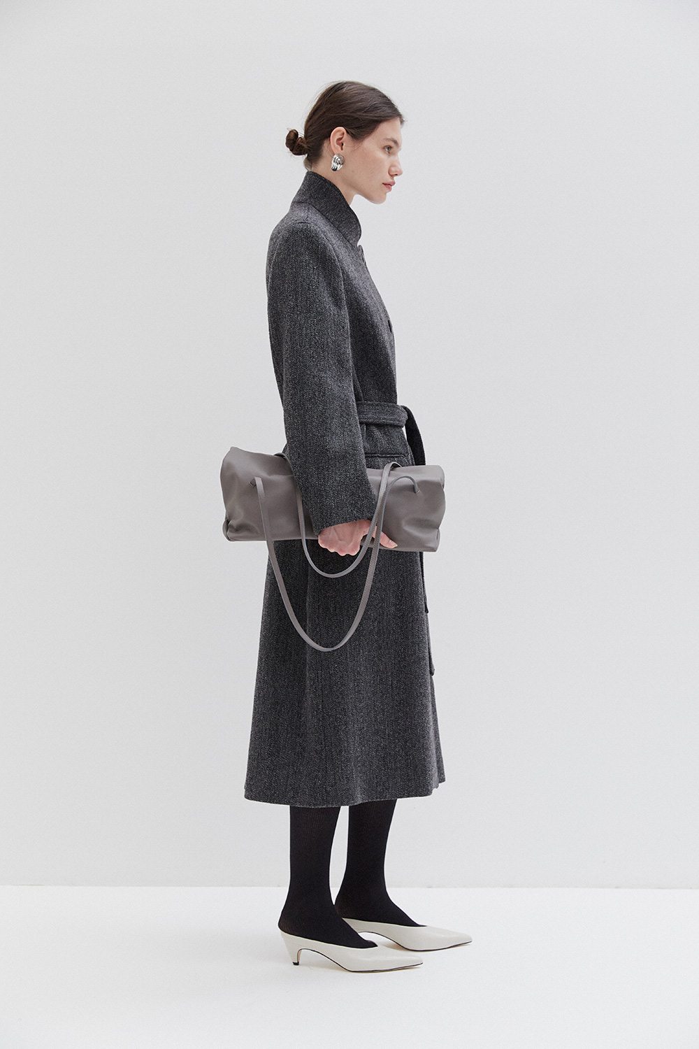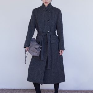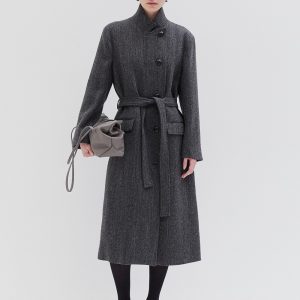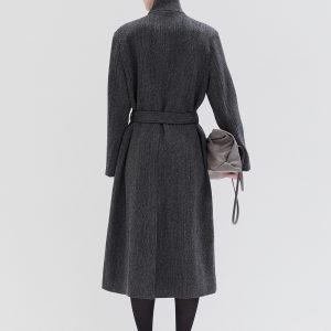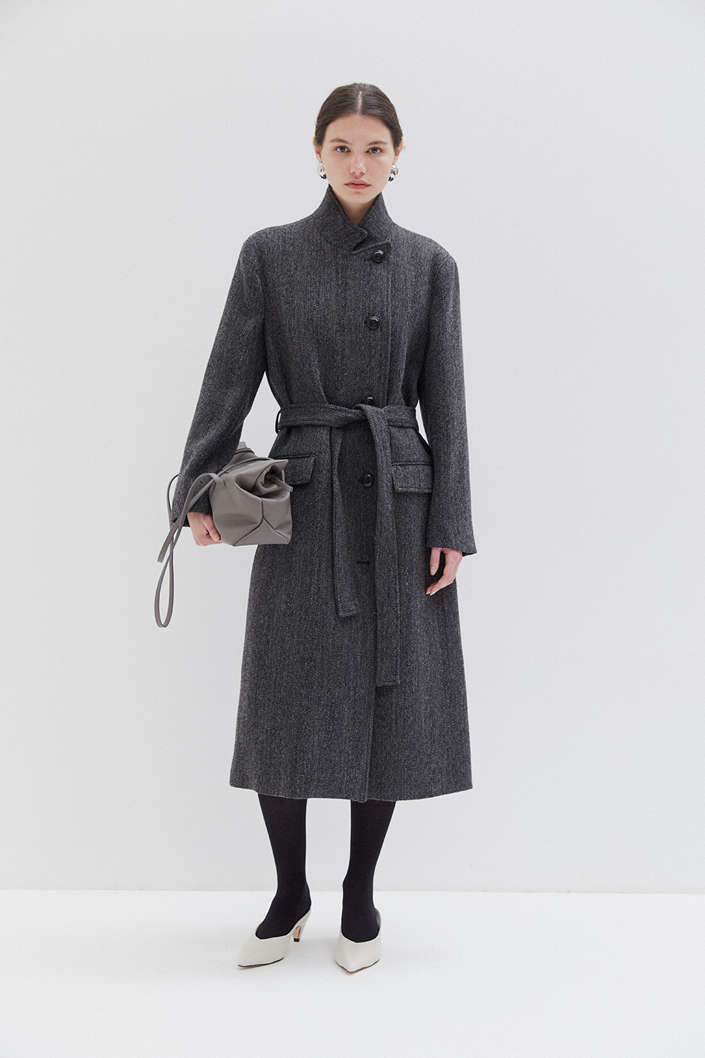 A coat that speaks in calm confidence. This long winter layer features generous shoulders, large lapels that close into a stand collar, and a matching belt for effortless waist definition. Made from a warm grey wool blend with a modern tweed effect, its subtly rustic texture channels a mature, contemporary take on countryside elegance.