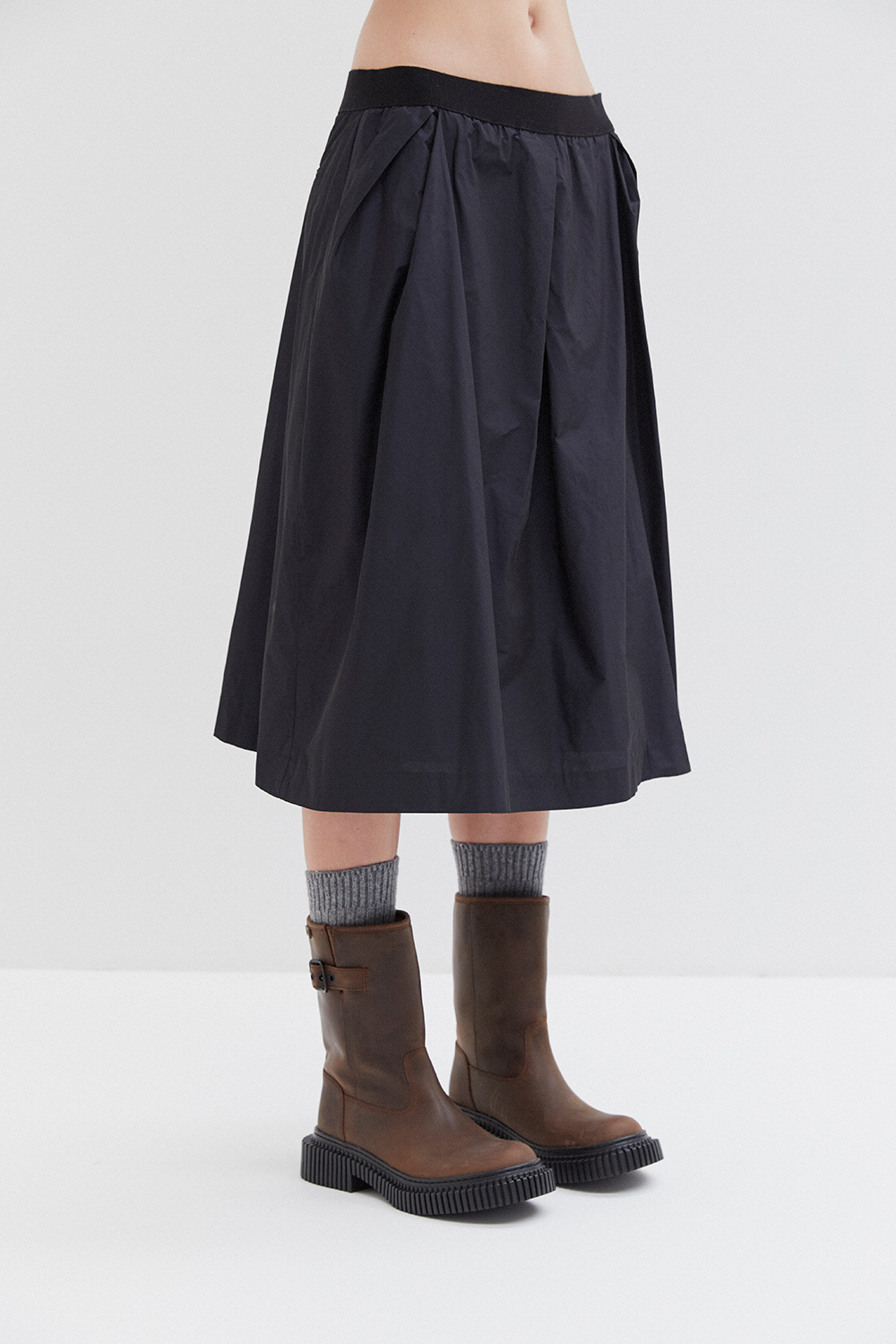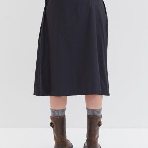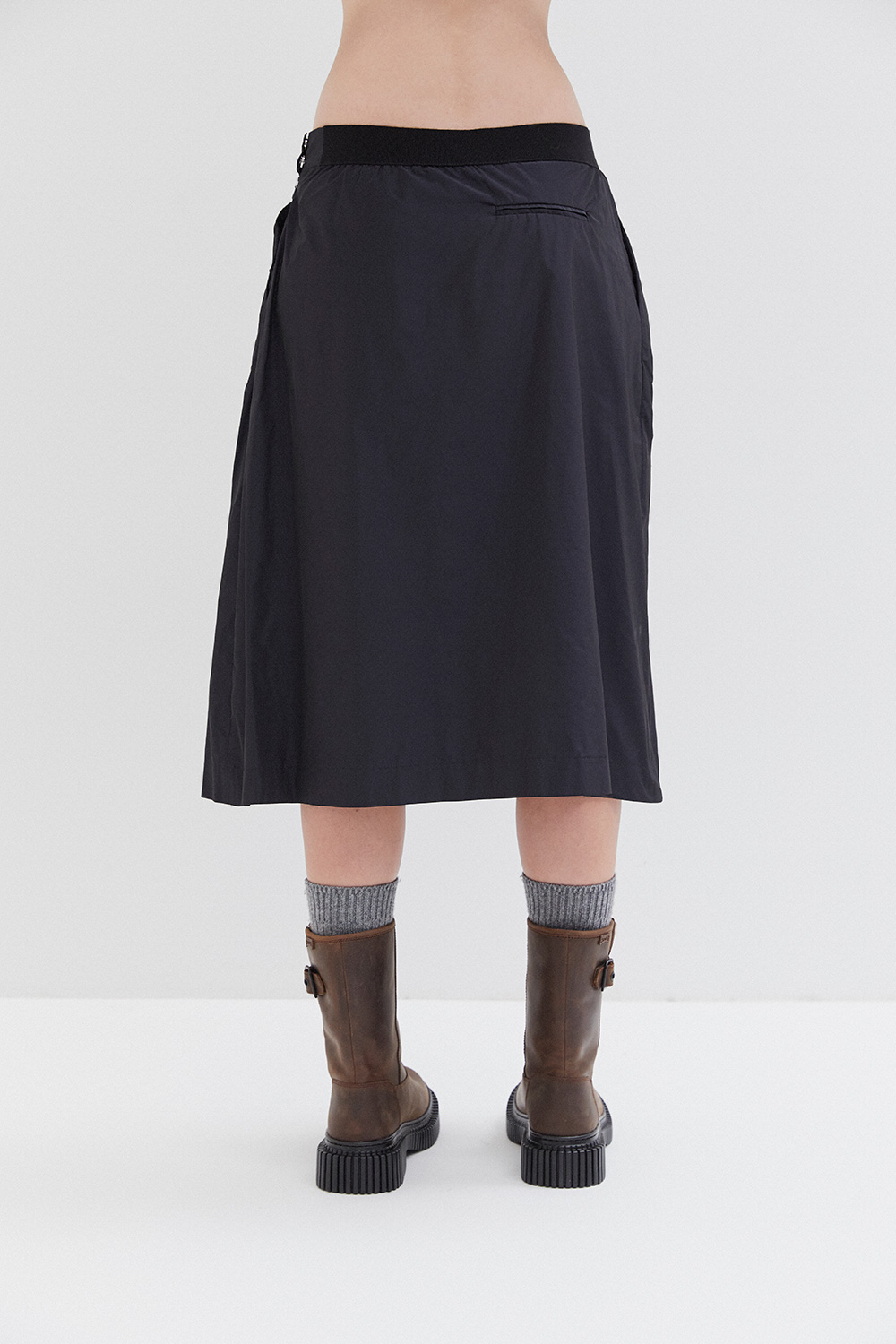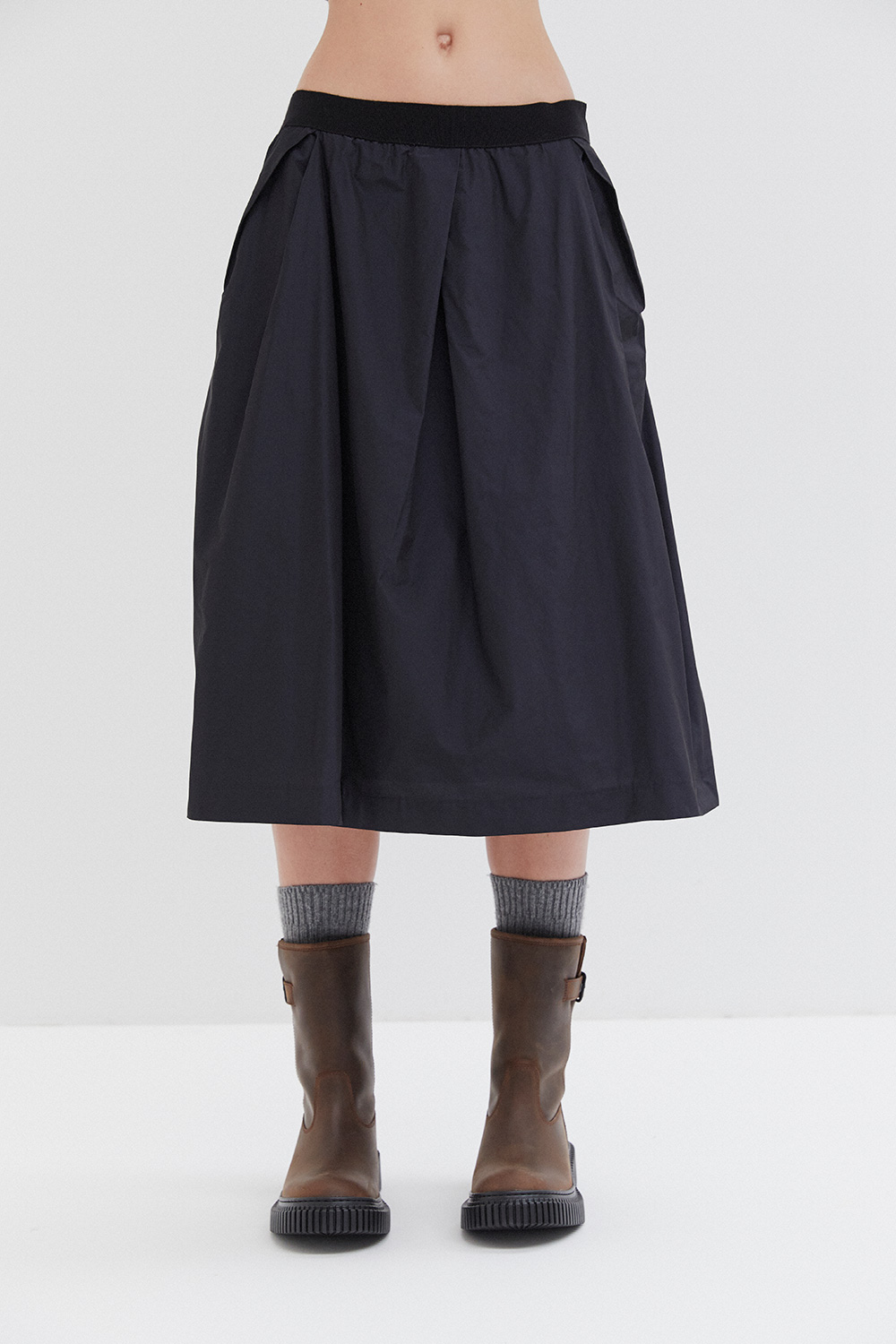 Cut from a Japanese fabric with crisp fluidity, this dark navy skirt is made for mid-season layering. It features a flared silhouette and tailored details like a black waistband and slanted pockets.