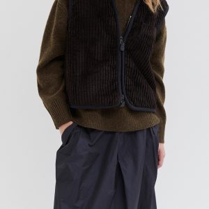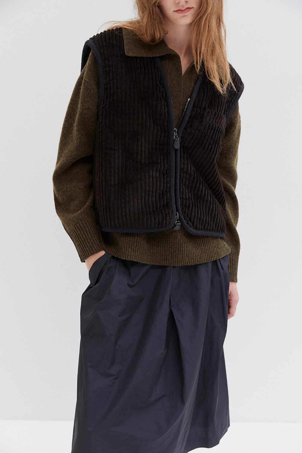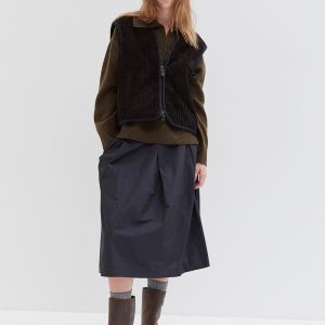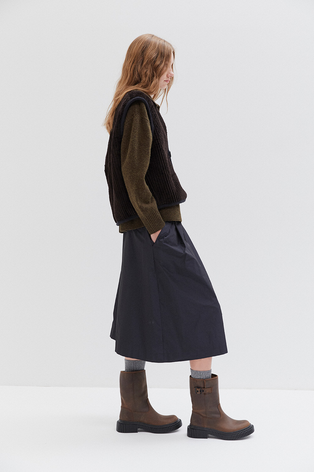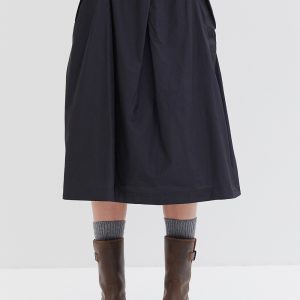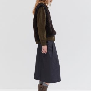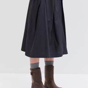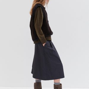 Cut from a Japanese fabric with crisp fluidity, this dark navy skirt is made for mid-season layering. It features a flared silhouette and tailored details like a black waistband and slanted pockets.