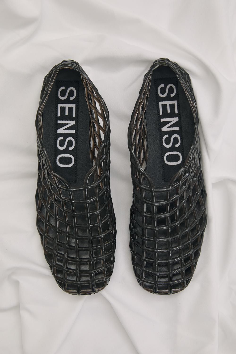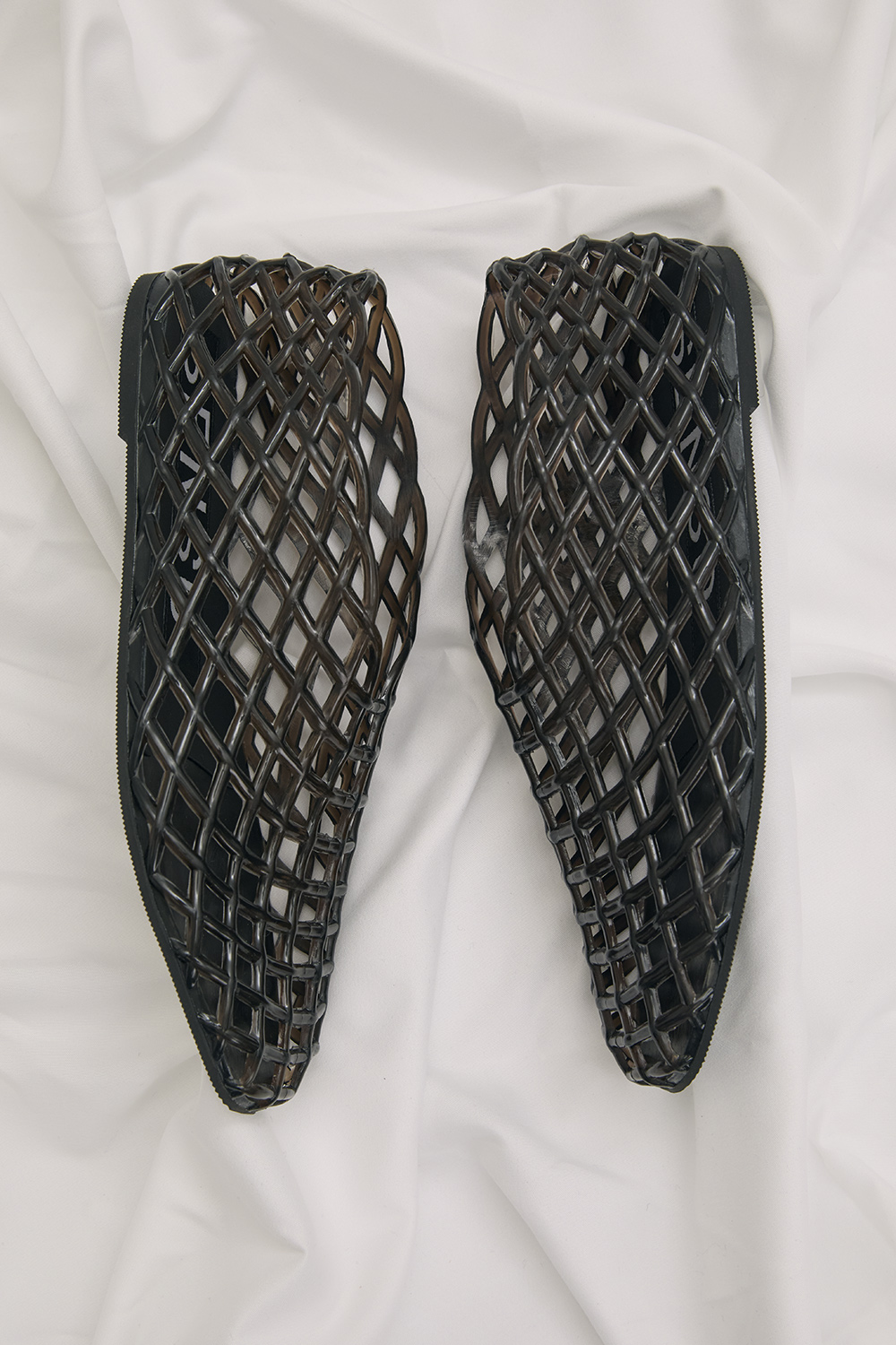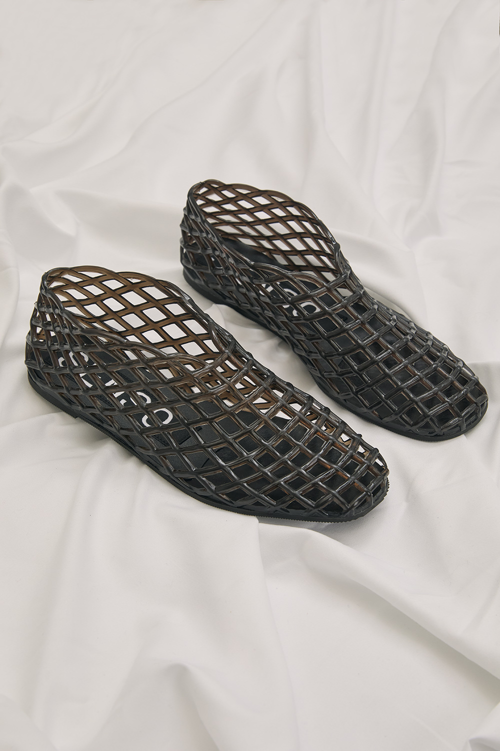 Ebony rubber netting ballet flats featuring a branded insole, round toe, slip-on style, and flat rubber sole.