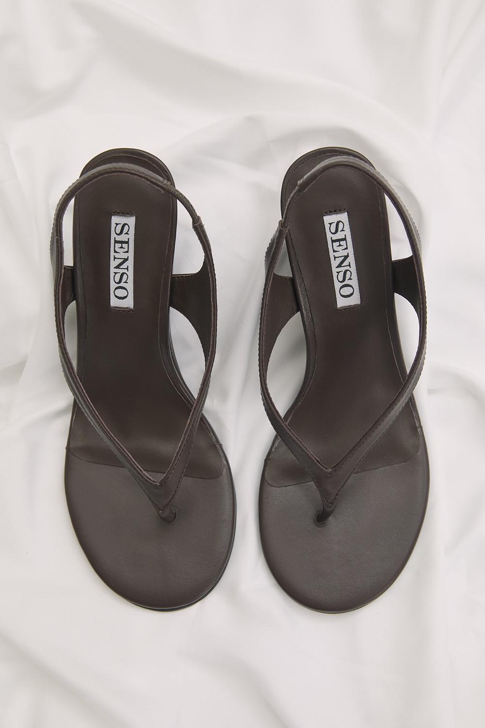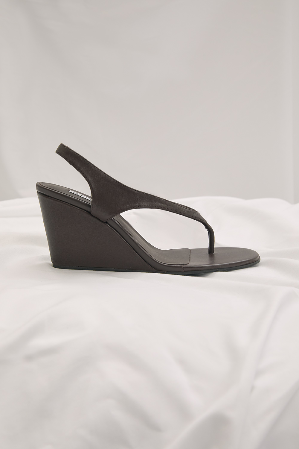 Chocolate kid leather wedge sandals featuring a thong silhouette with a slingback strap and open toe design.