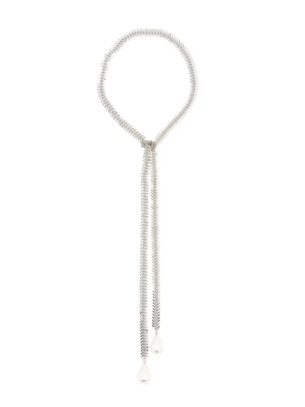 Extra long necklace with a tie effect, made with a strip of chain with a spiked shape and two pearl beads with crystal core at the ends. It can be worn with one or two strands and knotted in the center.