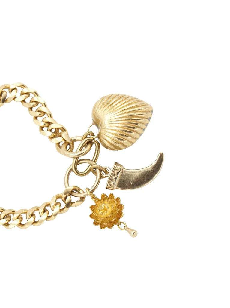 Mid-breasted necklace, composed of a brass ring chain, three pendants, flower, horn and heart shaped, and three multicolored natural stones in the clasp.