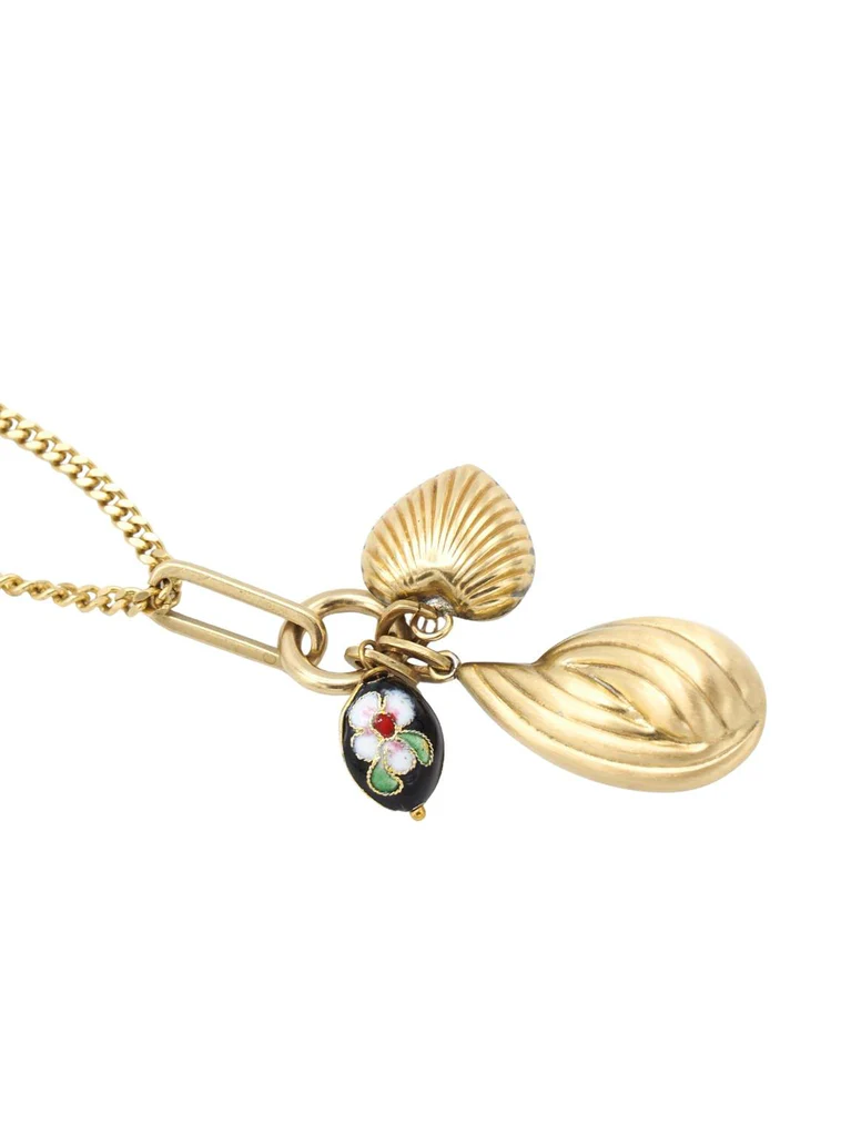 Long necklace, made with a brass ring chain, two pendants, drop-shaped and heart-shaped, and a third enameled pendant with floral pattern.