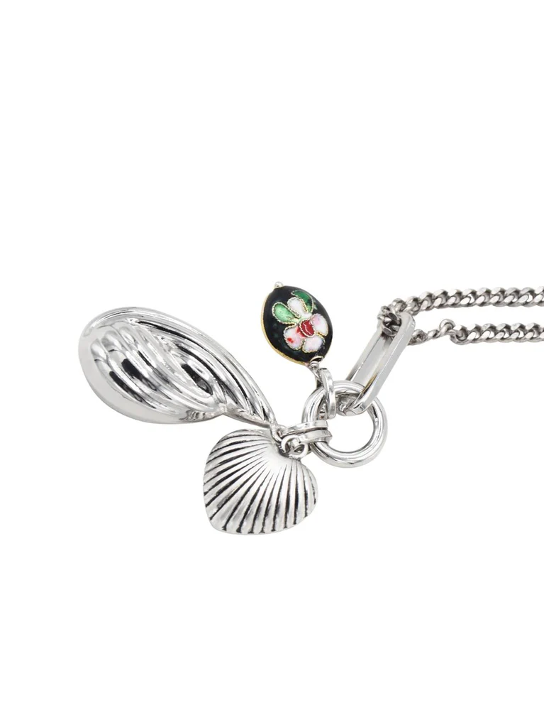 Long necklace, made with a brass ring chain, two pendants, drop-shaped and heart-shaped, and a third enameled pendant with floral pattern.
