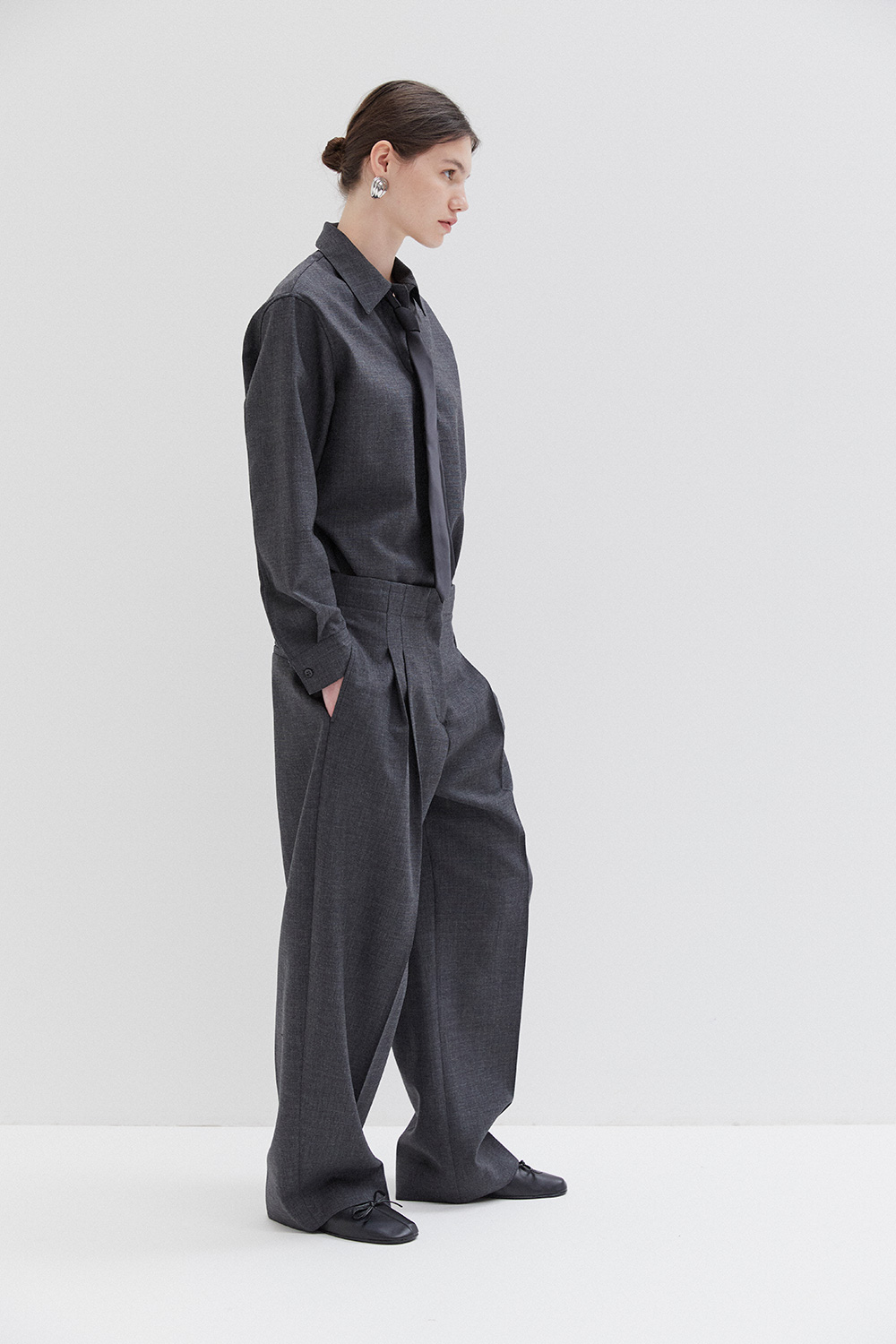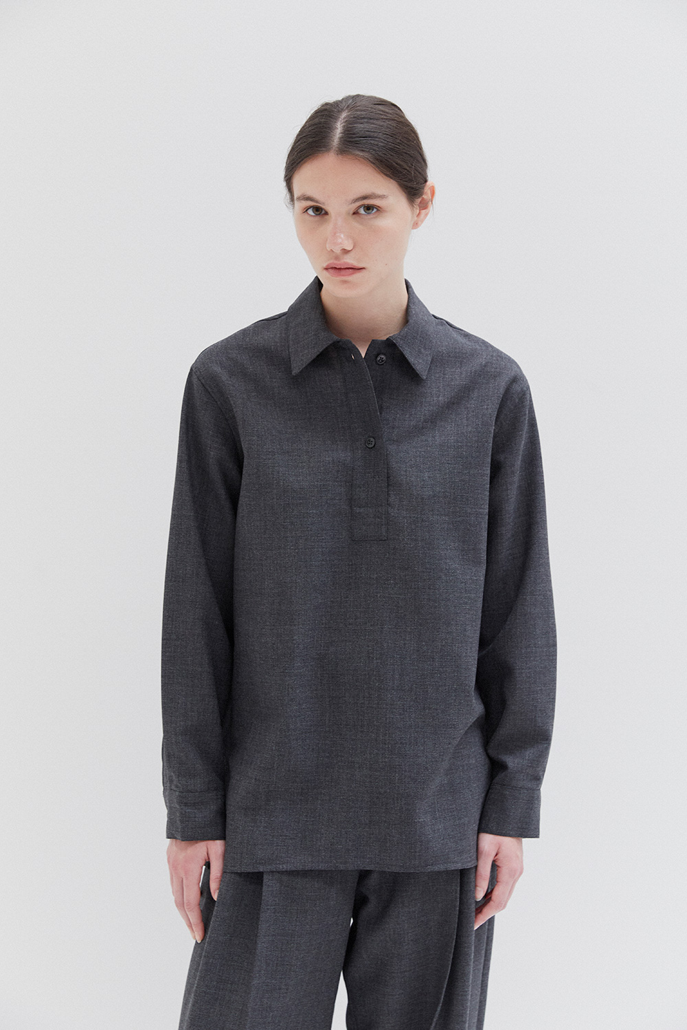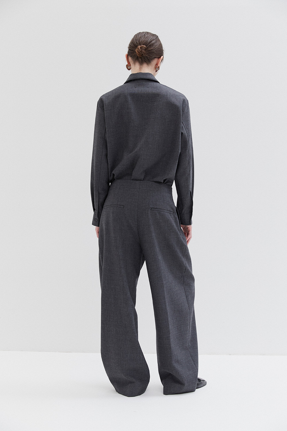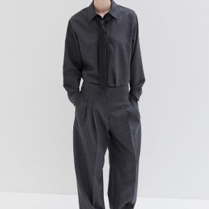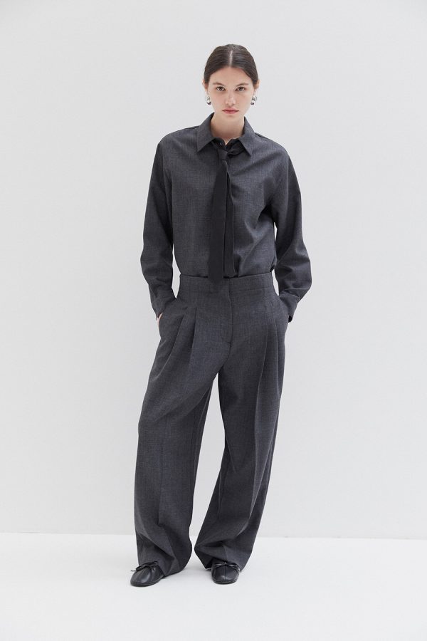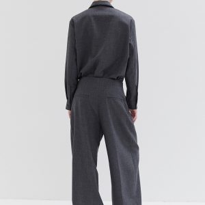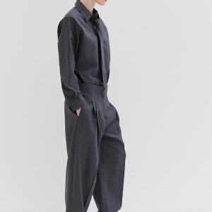 Studio Nicholson’s contemporary tailoring . Drawing on the slouchy tailoring prevalent in the 90s, the pant is shaped with a lower rise waist and a shorter length that highlights the curve in the leg. They’re cut from our heritage wool – a British-milled worsted wool selected for its breathability and a dry, crisp hand feel – and fitted with double reverse pleats. The shirt is crafted with a half-placket front. It’s cut from our heritage wool: a British-milled worsted wool selected for its breathability and a dry, crisp hand feel. A wardrobe pillar that straddles the line between smart and casual, Pinole is made with dropped shoulders and soft curves in the side seams that subtly amplify the fluid silhouette.