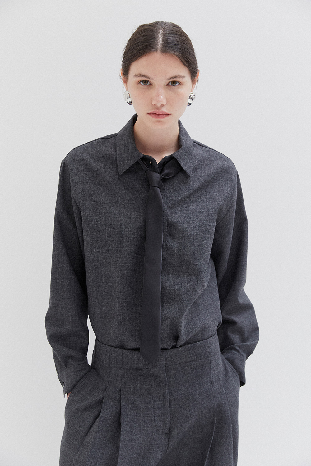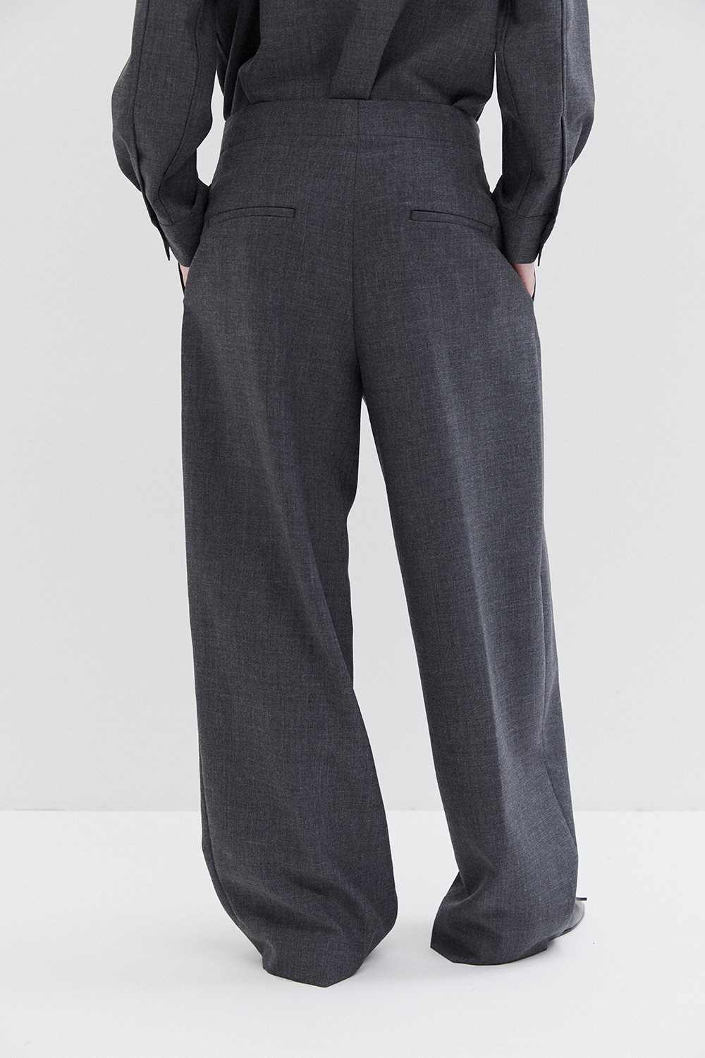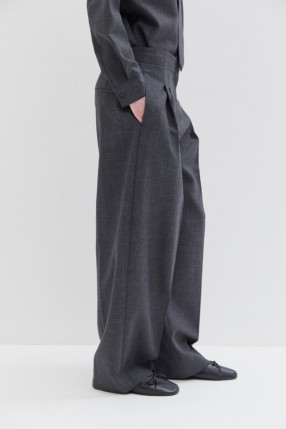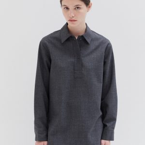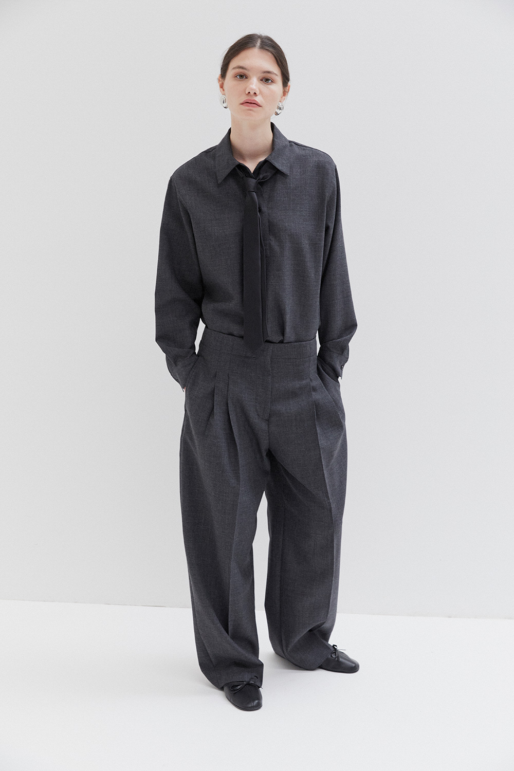 Studio Nicholson’s contemporary tailoring . Drawing on the slouchy tailoring prevalent in the 90s, the pant is shaped with a lower rise waist and a shorter length that highlights the curve in the leg. They’re cut from our heritage wool – a British-milled worsted wool selected for its breathability and a dry, crisp hand feel – and fitted with double reverse pleats. The shirt is crafted with a half-placket front. It’s cut from our heritage wool: a British-milled worsted wool selected for its breathability and a dry, crisp hand feel. A wardrobe pillar that straddles the line between smart and casual, Pinole is made with dropped shoulders and soft curves in the side seams that subtly amplify the fluid silhouette.