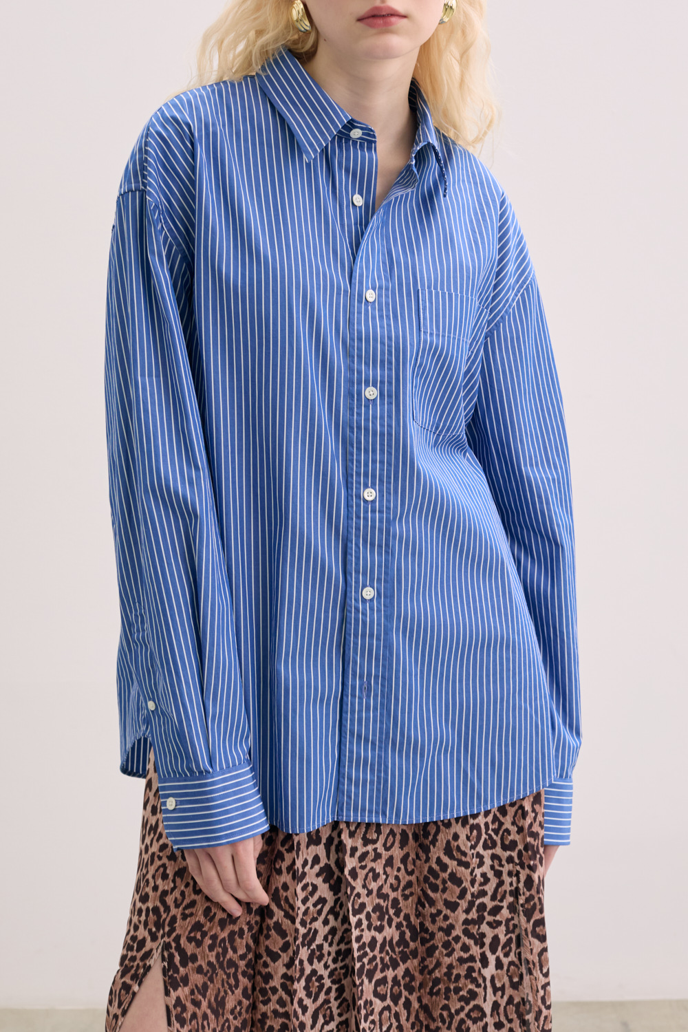 Classic button up shirt with locker loop and pleat in back. Fitting is slightly oversized.