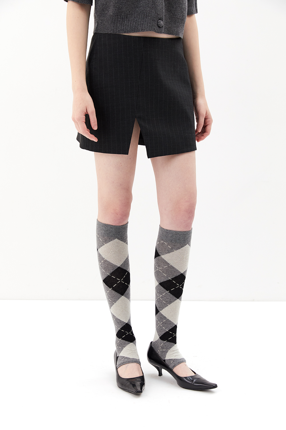Classy, elegant mini skirt with a subtle light grey lined pattern elevated by a cut-out detail and a decorative sewn-on back pocket.