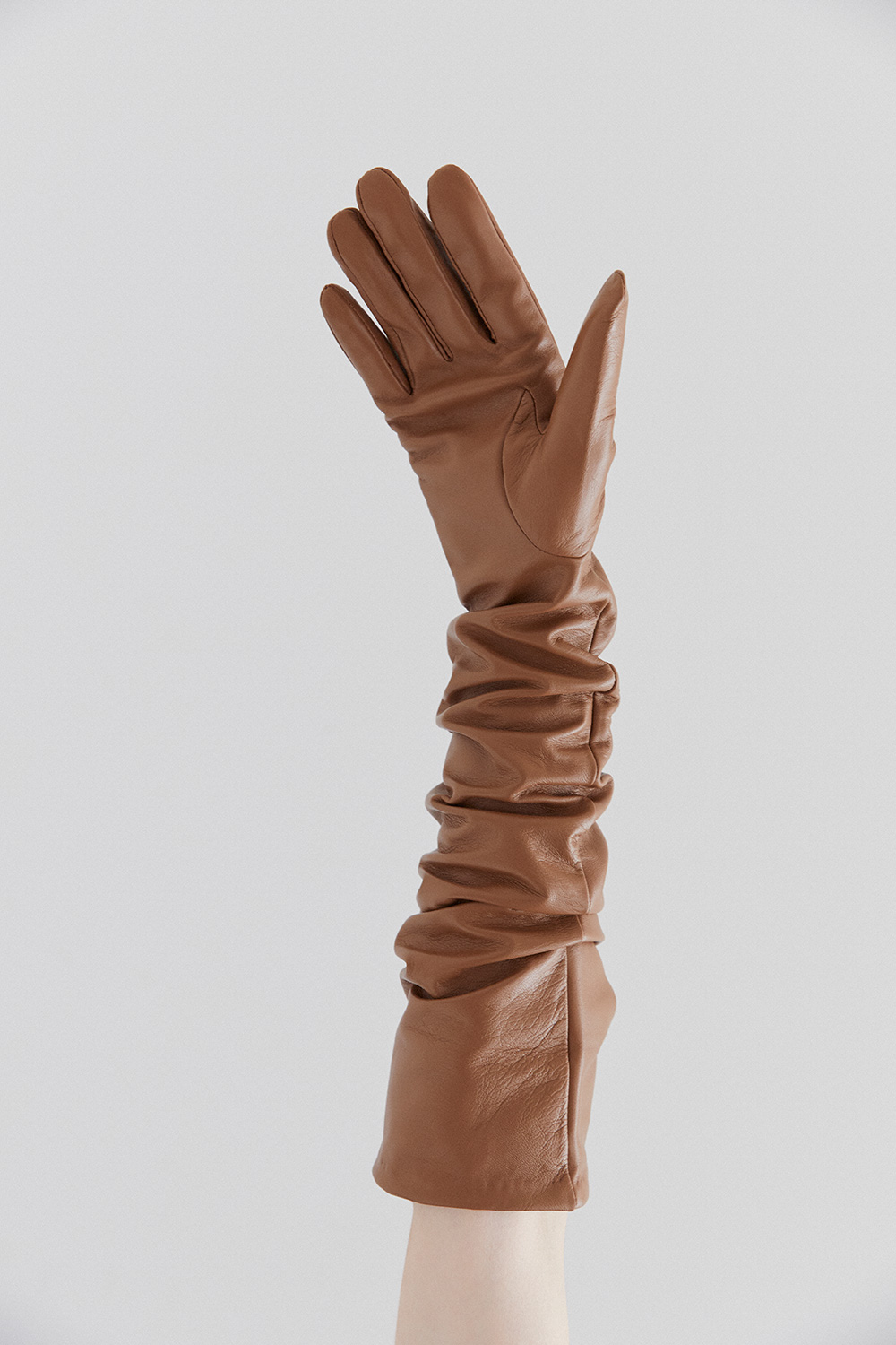 The TG Gloves are crafted from 100% goatskin leather and designed in an elegant elbow-length silhouette. A true statement accessory that elevates your wardrobe for any special occasions.