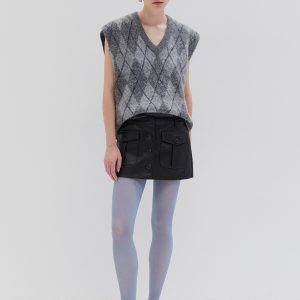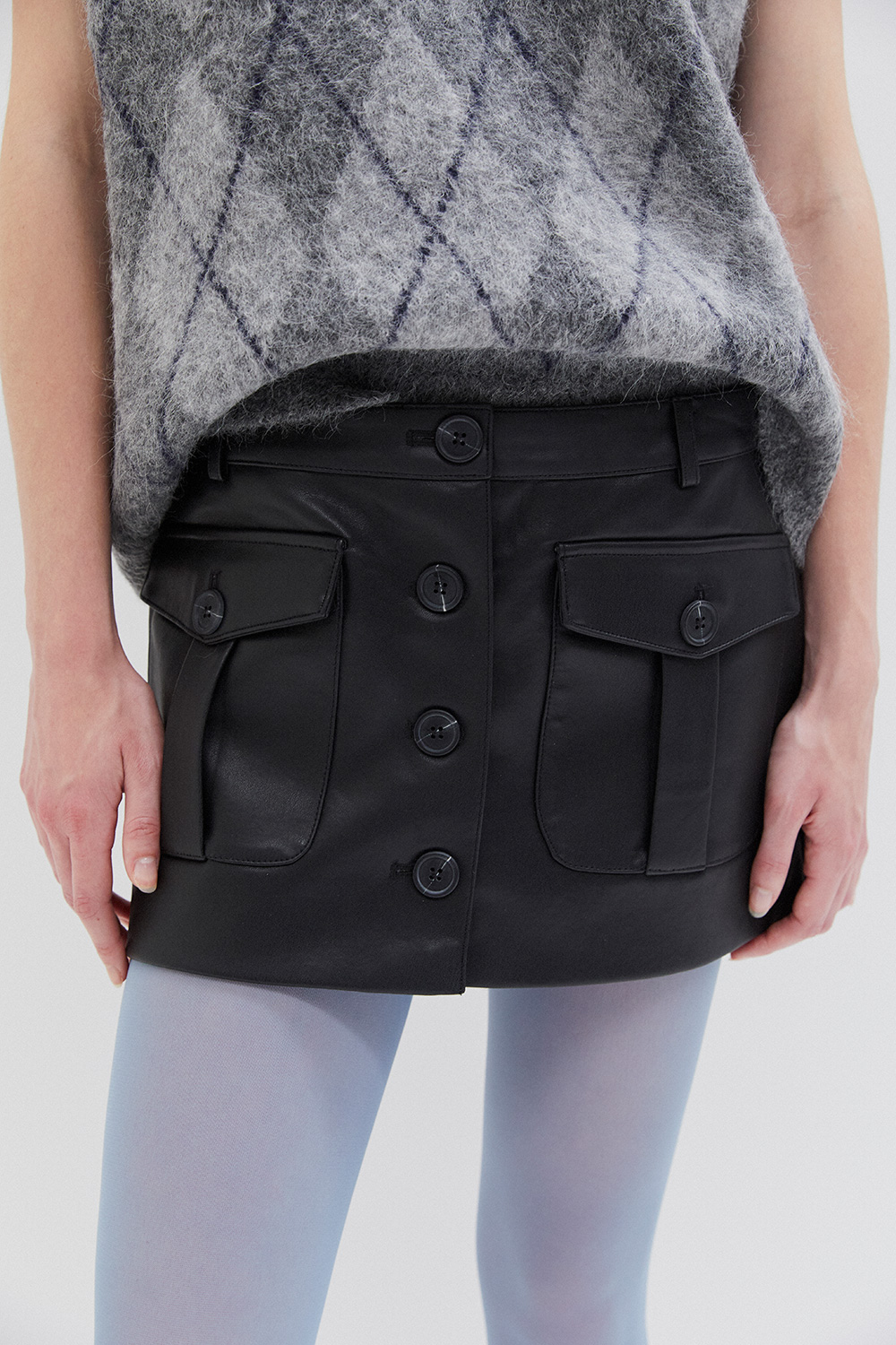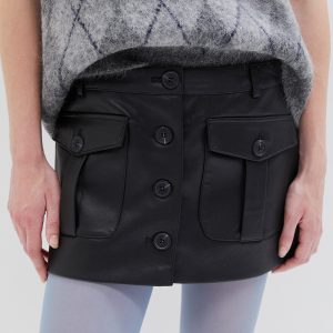 A classy, elegant mini skirt elevated by a sleek leather-look finish. Designed with two big front pockets, a decorative button row and a belt option, it unites functionality with a fashion-forward silhouette.